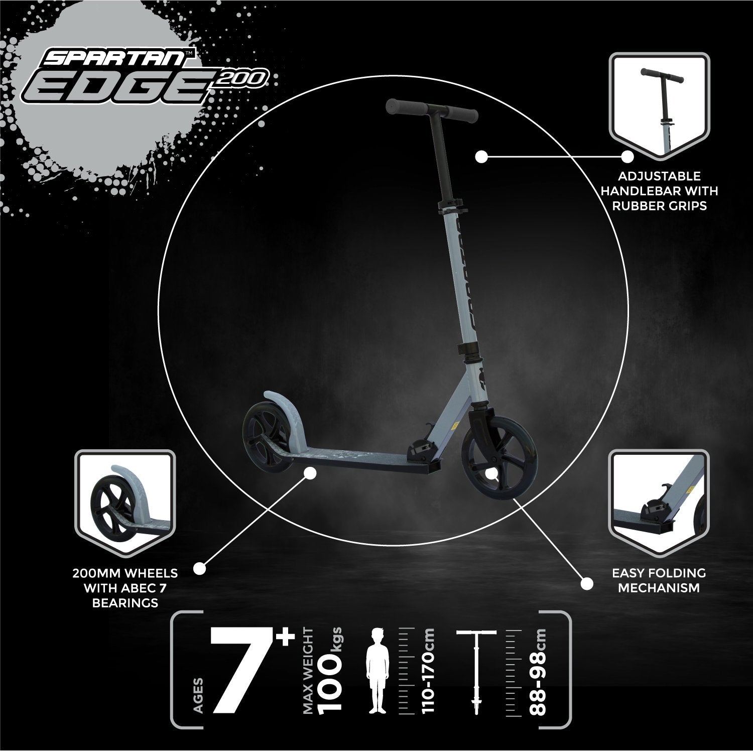 The Spartan Folding Kick Scooter with 200mm wheels delivers a cool and fun look as you roll smoothly around the neighbourhood or the park. The lightweight design makes it easy to handle and move from one point to another with better balance.