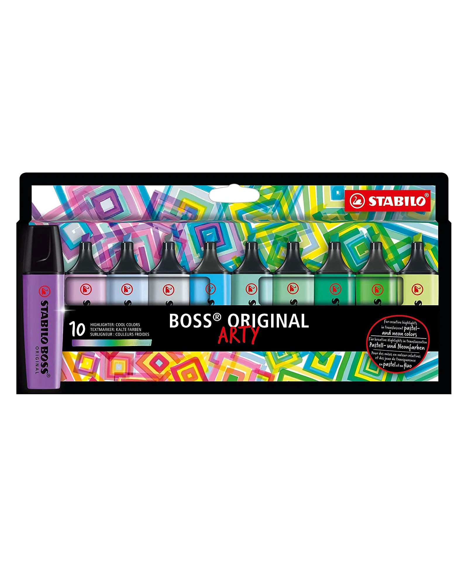 The Stabilo BOSS ORIGINAL Pastel highlighter is the hot accessory for your desk! It comes in 10 Soft pastel colours for a fresh, colourful look on paper. The highlighter can Underline and emphasise, thanks to the chisel tip that enables 2 line widths – 2 mm and 5 mm. The design classic in pretty pastel shades allows you to structure your work and is perfect for school, university, the office and creative work. The 4 hour dry-out protection allows you to concentrate on your work. Highlighting – with proven Stabilo quality, of course! Also ideal for those with creative minds for colouring, shading and framing for hand lettering or bullet journals, for example.