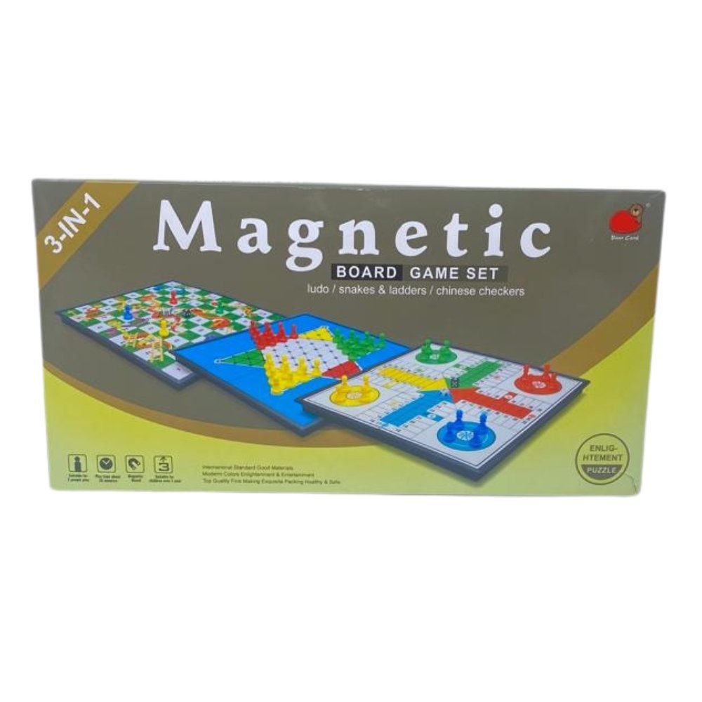 The 3-in-1 Folding Magnetic Board Game Set is a versatile and convenient game collection suitable for children. This set includes three classic board games: Checkers, Snakes and Ladders, and Dice. With its foldable magnetic board and compact design, it's perfect for travel, family game nights, and educational play.