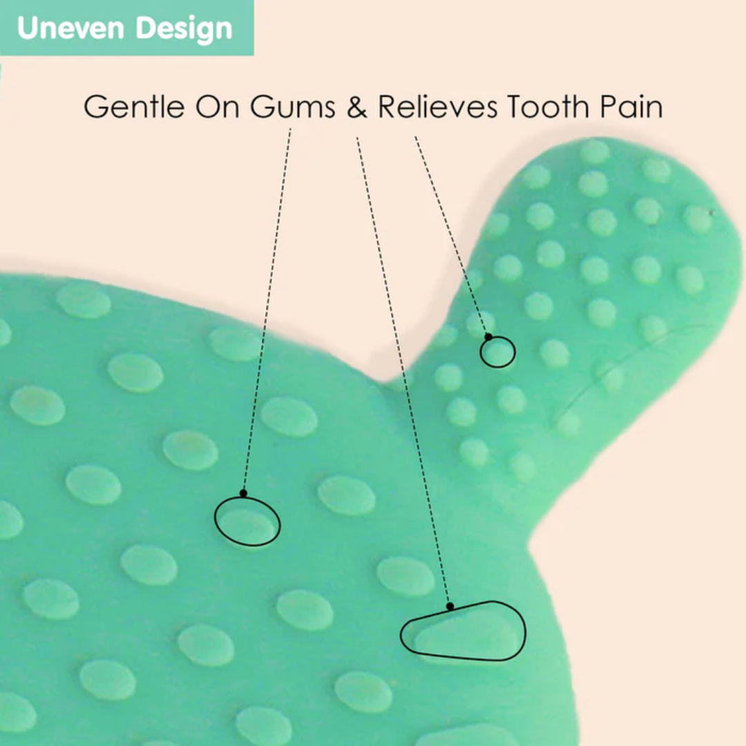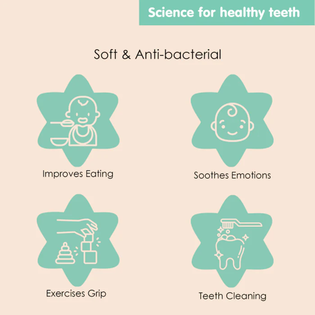 - Soft, flexible silicone soothes sore gums during teething