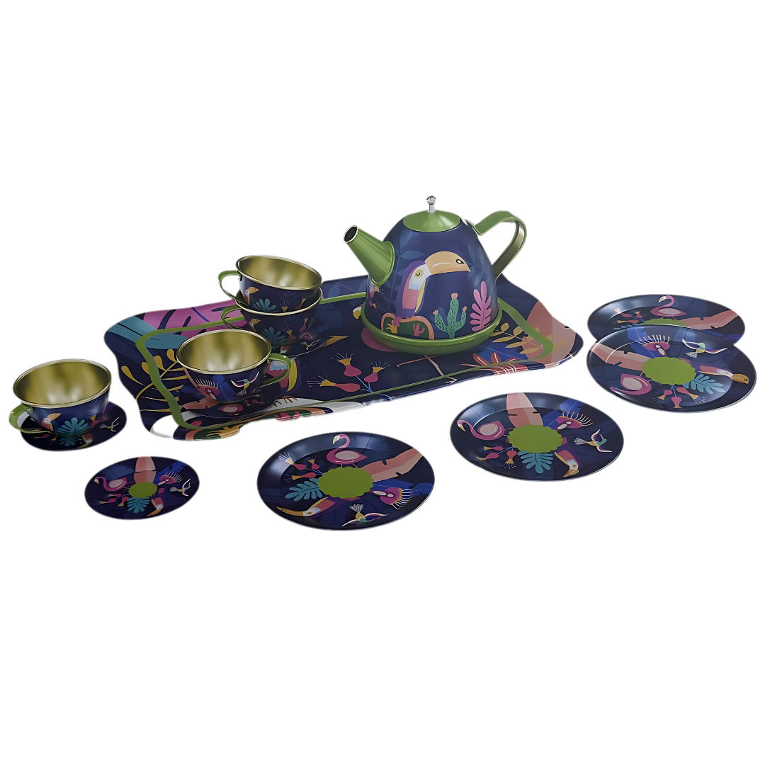 - Complete Tea Party Set: Includes 1 metallic teapot with lid, 1 matching tea tray, 4 plates, 4 saucers, and 4 teacups - everything needed for a full pretend tea service.