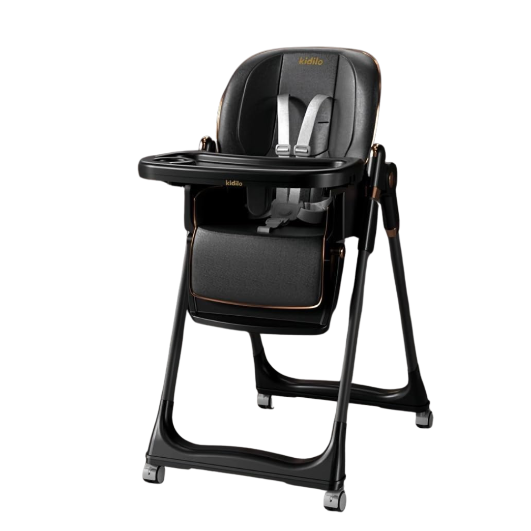 The chair’s lightweight, foldable frame and 360-degree rotating wheels make it easy to move, store, and use throughout your home. Built with a stable golden tower-style leg structure and a 5-point safety harness, the Kidillo High Chair ensures your child stays securely in place during every meal.