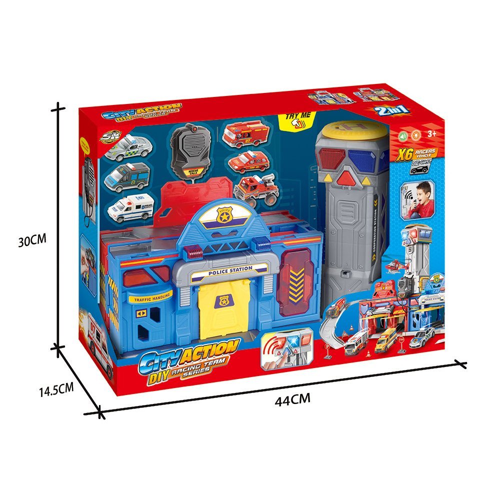 Embark on thrilling adventures with our 2-in-1 Fire Station & Police Station in the My Take Along Parking Lot playset. This set features 6 Racer Vehicles made of high-quality die-cast material, complete with captivating light and sound effects. Designed for interactive play, this portable parking lot offers endless imaginative scenarios for children to explore.