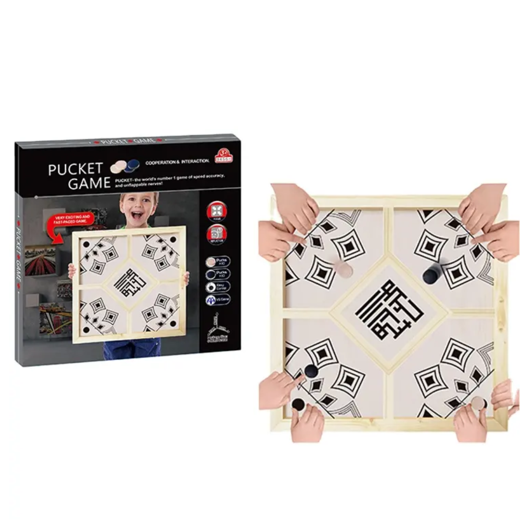 Made for speed and laughter, this wooden tabletop game is all about launching all your pucks to the opponent's side before they do the same to you. Think fast, aim sharp, and shoot with precision.