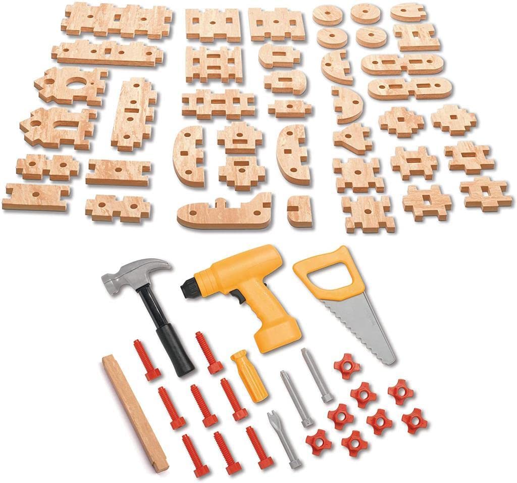 • Sturdy table with “wood grain” legs has built-in spring-action vise, pull-out storage bin and top and bottom shelves to place toy tools and keep your play room neat and organized.