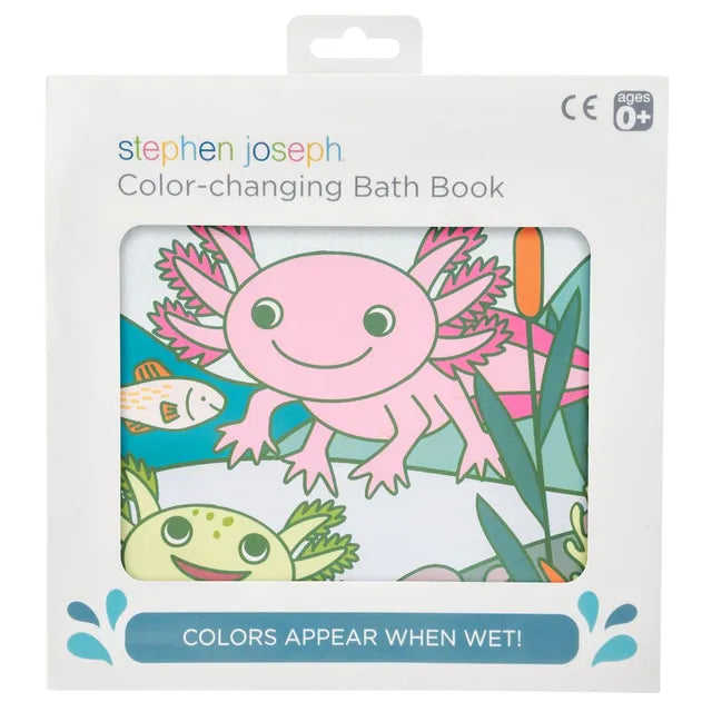 This magical color-changing bath book from Stephen Joseph turns bath time into story time! Featuring a fun Axolotl theme, the soft PEVA pages reveal bright, cheerful colors when wet—captivating kids as they splash and play. Perfectly sized for little hands, each page features adorable illustrations and a gentle story that encourages imagination and sensory development. The water-activated color change technology offers a multi-sensory experience, helping to keep children entertained and engaged during bath time. Lightweight, durable, and mold-resistant, it's an excellent addition to your child’s bath toy collection.