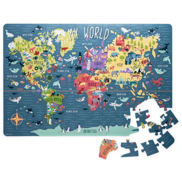 - 100-piece world map floor puzzle packed in a sturdy gift box