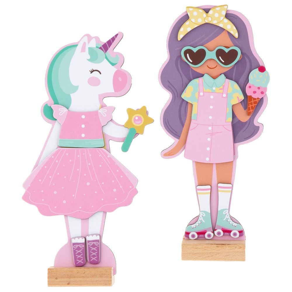 - Each set includes two characters with wooden stands and 40 magnets to create countless creative combinations.