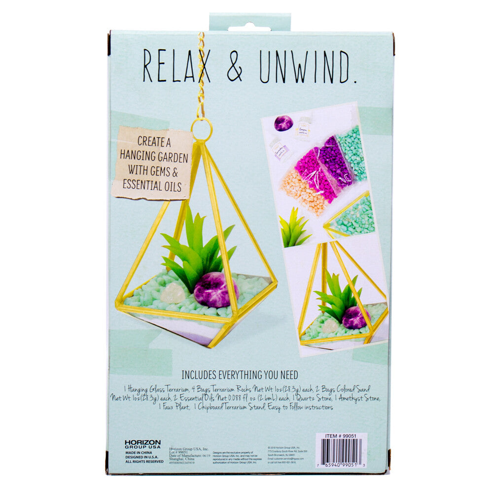 - Kit includes: 1 glass terrarium, 2 gemstones, 1 Faux plant, 2 bags of colored sand (1oz) each, 4 bags of colored rocks (1oz) each, 2 essential oils (2.6ml) each