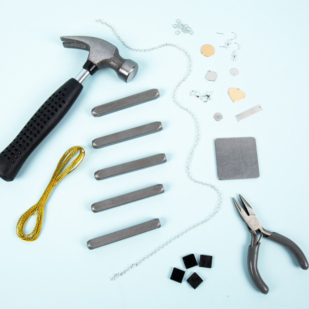 - Incudes: 6 x Charms, 6 x Metal Stamp, 4 x Rubber Feet, 1 x Pair of Pillers, 1 x Hammer, 2 x Fishhook Earring Findings, 1 x Chain, 1 x Skein of Mettalic, 11 x Jump Rings, 2 x Lobster Clow Clasps, 1 x Instructions Book