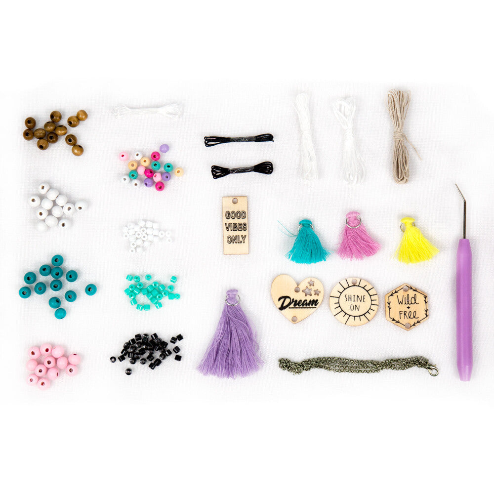 - Create trendsetting jewelry accented with vibrant colors, encouraging phrases and cool textures with the STMT Wooden Charm and Tassel Jewelry kit