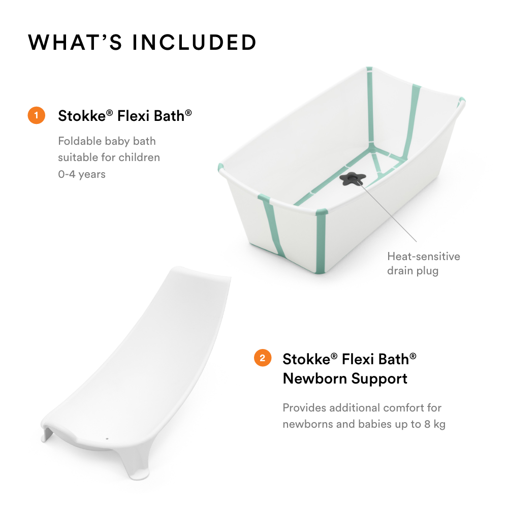 Stokke Flexi Bath is a foldable baby bath suitable from birth to four years. The space saving design makes it easy to store and convenient to use at home or when travelling, encouraging more shared bath time moments. The optional Stokke® Flexi Bath® Newborn Support provides additional comfort for newborn babies. Because Stokke are always striving to improve our products, we´re offering a heat sensitive drain plug. The plug works by turning colors, giving parents a visual cue, letting them know that the water temperature is getting warmer and needs to be checked. Please note that the plug is not a thermometer. Always double-check the water temperature with your hand to ensure that it is the right temperature for your baby´s comfort and safety. If you are in any doubt, use a reliable thermometer for accuracy.