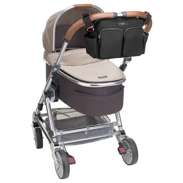 This 2-in-1 stroller organiser and compact changing bag simply has it all. Crafted from recycled nylon manufactured from post consumer waste, the stylish outer features 4 pockets for easy storage of essentials while the spacious interior can house all items needed for you and baby and includes an insulated bottle sleeve. The long strap includes our patented built-in stroller straps, so you can wear as a cross body or easily attach to your pram.