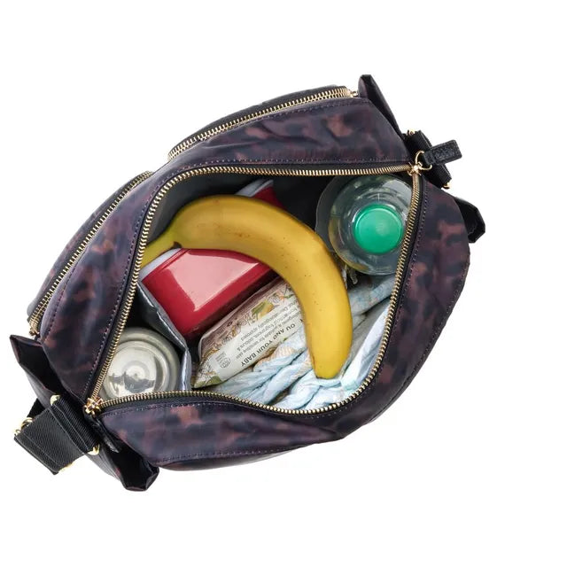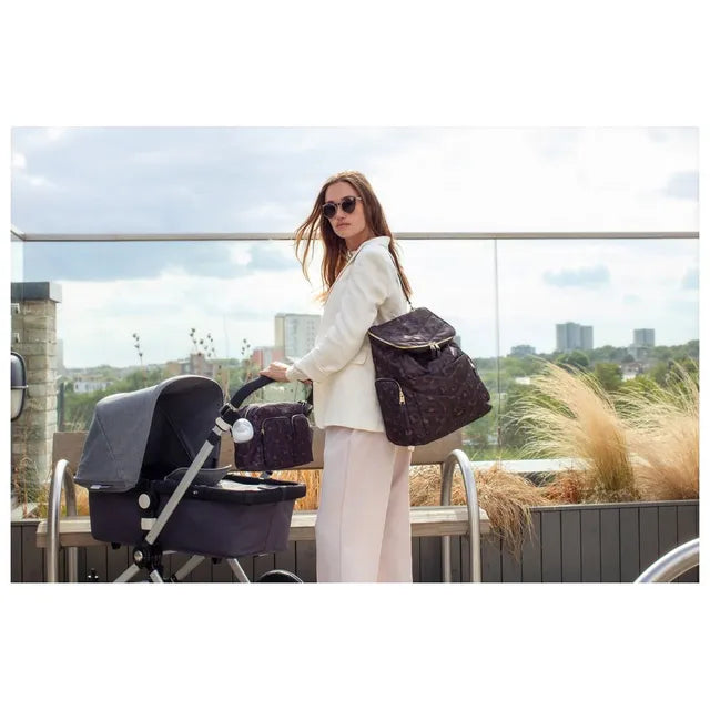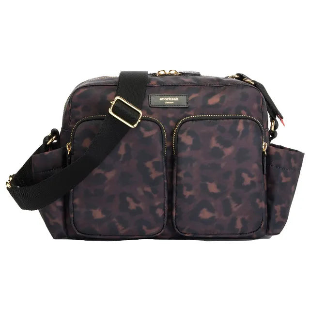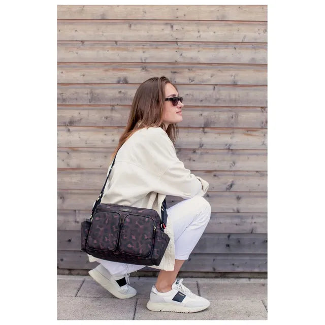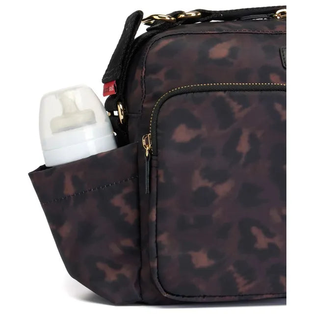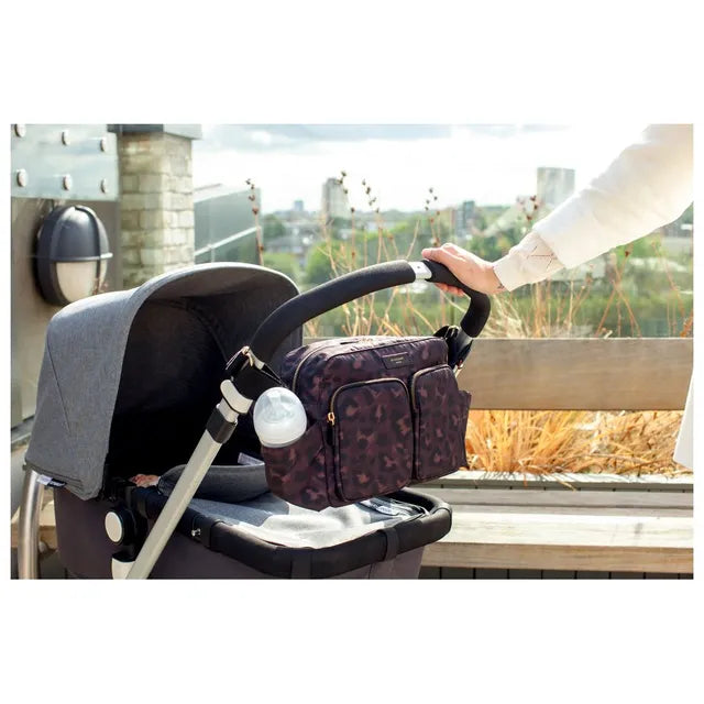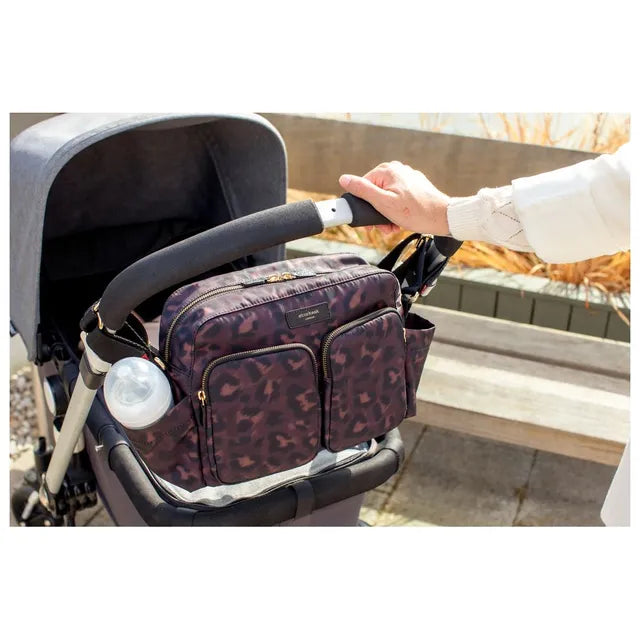 This 2-in-1 stroller organiser and compact changing bag simply has it all. Crafted in a durable material and featuring a subtle leopard print, the stylish outer features 4 pockets for easy storage of essentials while the spacious interior can house all items needed for you and baby and includes an insulated bottle sleeve. The long strap includes our patented built-in stroller straps, so you can wear as a cross body or easily attach to your pram.