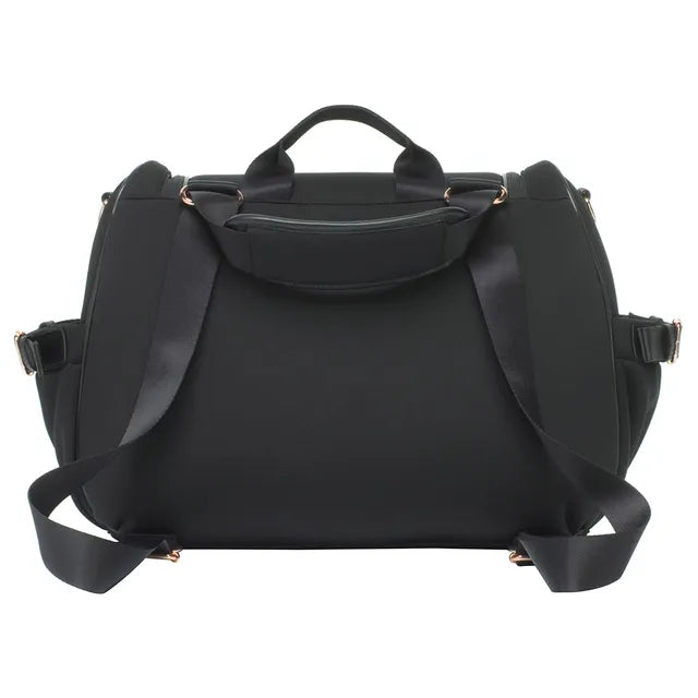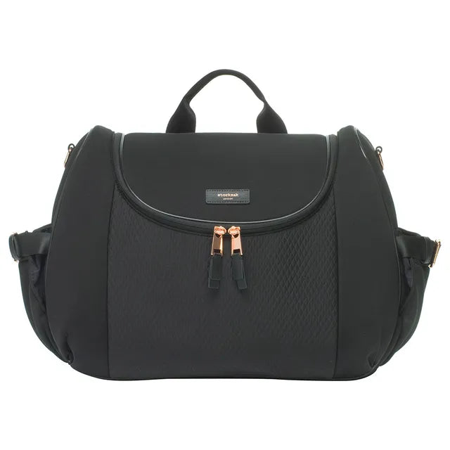 Crafted from durable, water-resistant scuba, accented by smooth leather trims and statement hardware details adding an elegant touch to this practical design. Effortlessly convert this style from shoulder bag to backpack with the pull through nylon strap. Boasting supreme functionality with its wide opening into a roomy interior containing a multitude of pockets for easy access to your safely stored essentials and featuring a luxurious over-sized changing mat with pocket storage, insulated FAB bag and detachable stroller clips.