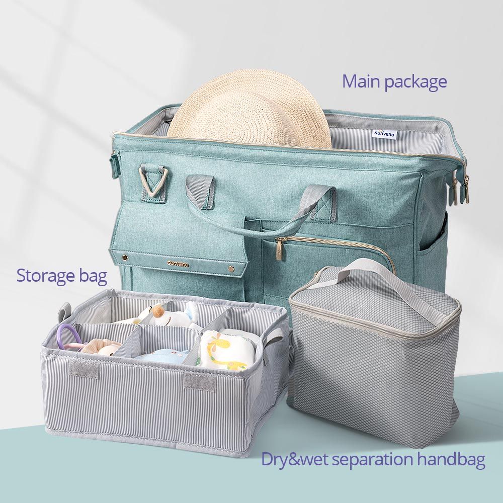 The Sunveno brings together exquisite design and perfect mix of functionality into an oversized sized Travel Set. Accented By Smooth PU Leather Trims and Upscale Gold Zipper Details add an Elegant Touch To This Practical Design. Featuring an additional premium Diaper Caddy along with a Dry-Wet Messy Bag, this Travel Diaper Bag boasts multiple pockets and a large size for accommodating all your Baby essentials. The cleverly configured carry ways like crossway makes sure minimum load is on the shoulders. The back strap also allows you to attach it on the suitcase handlebar while travelling. Perfect for both Men and Women, this is a complete Travel Set