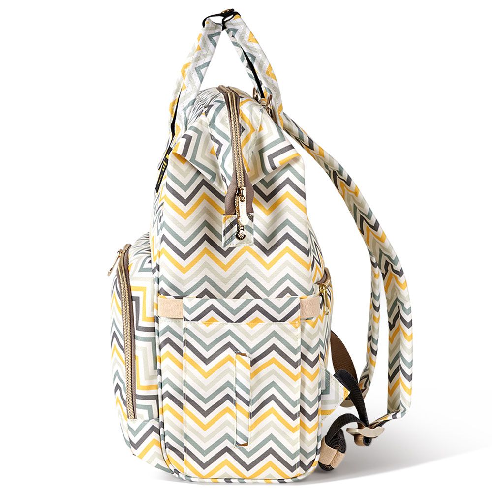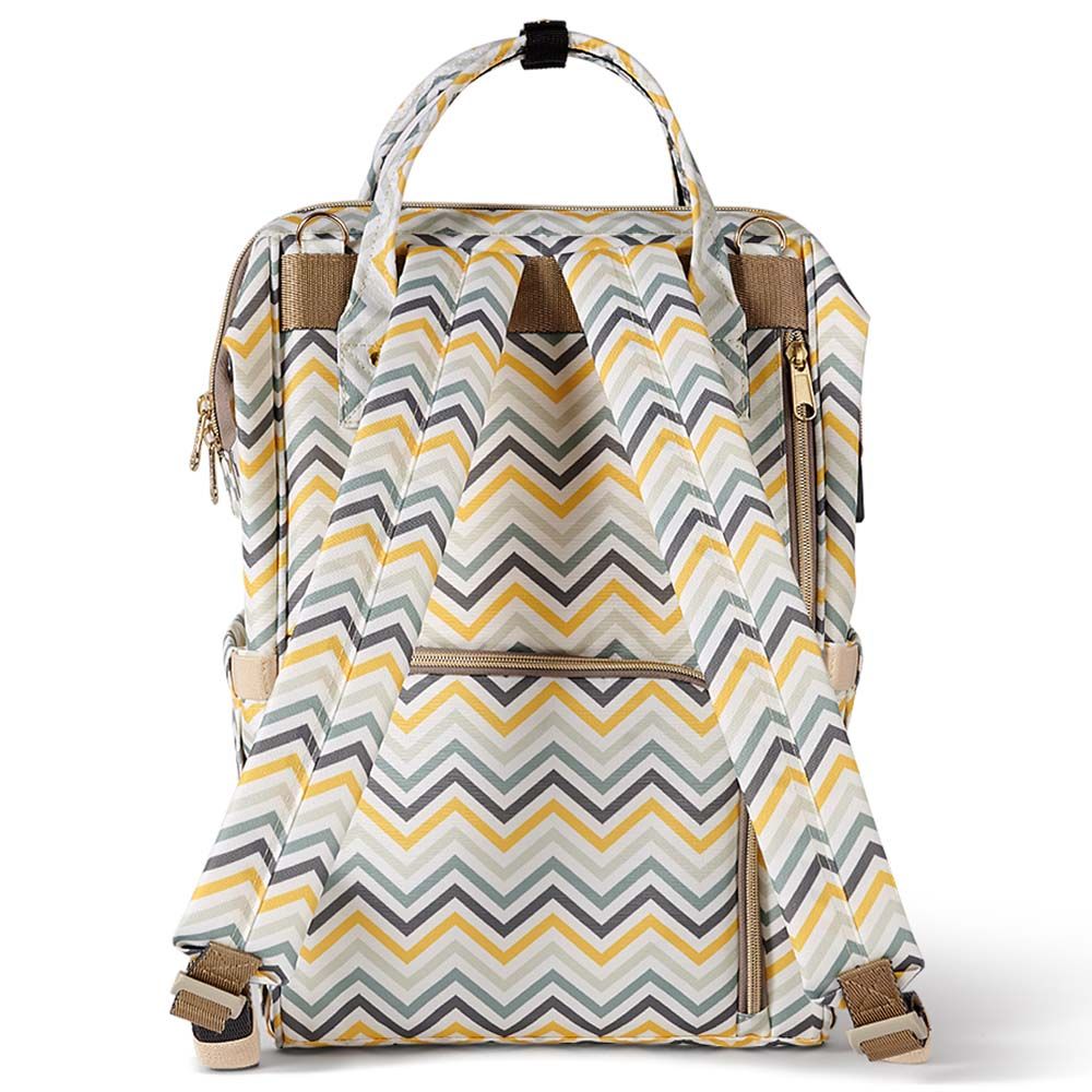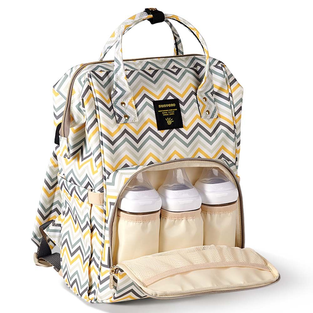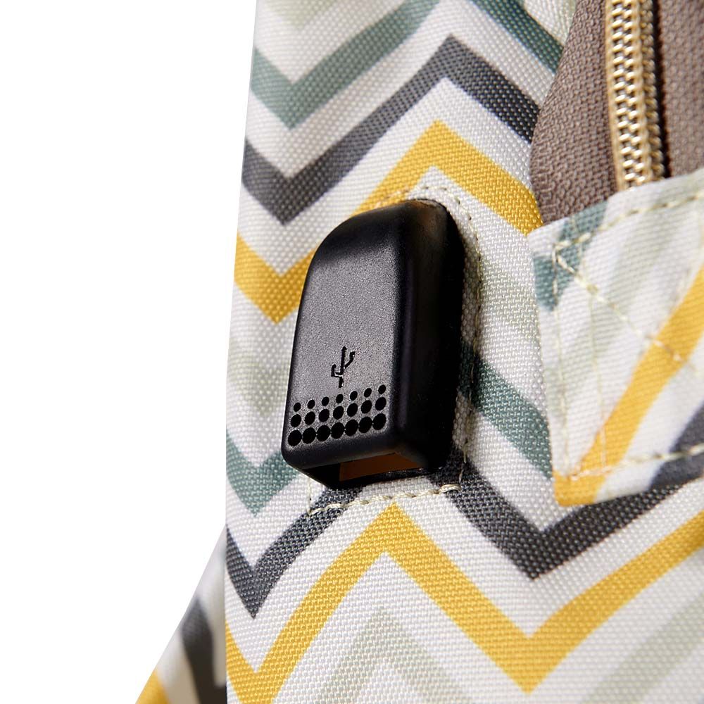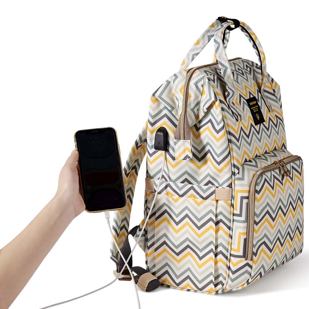 For the Stylish and Traveller Mom's, the same favourite Sunveno diaper Bag with a USB Port. Now you can charge phone with a powerbank,while your phone is outside the bag. This Sunveno diaper bag comes with beautiful colors and a Yellow Wave Print to bring out that amazing freshness and zeal in you! The wide zipper opening with metal support and beautifully crafted golden zippers give this bag a royale look. Despite all the space and accessories, this a light weight bag weighing only 820 gms, Not even a Kg! The unique features being the back opening zipper and tissue/wipes holder side pocket, both of these allow you easy access when you need tissues and clothes handy. A key chain holder helps you to access your house and car keys, when your one hand is busy carrying your little munchkin. Use it for twins or siblings, you would love to pack your bags on the go