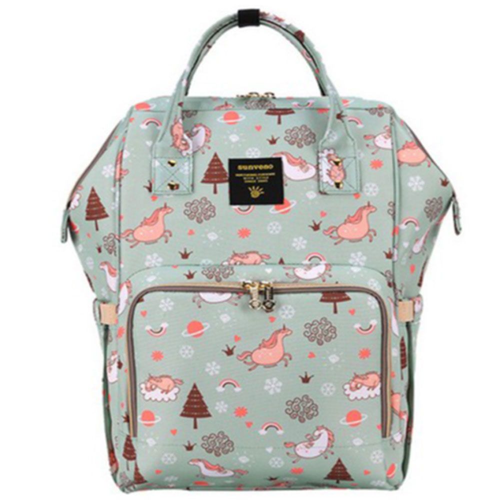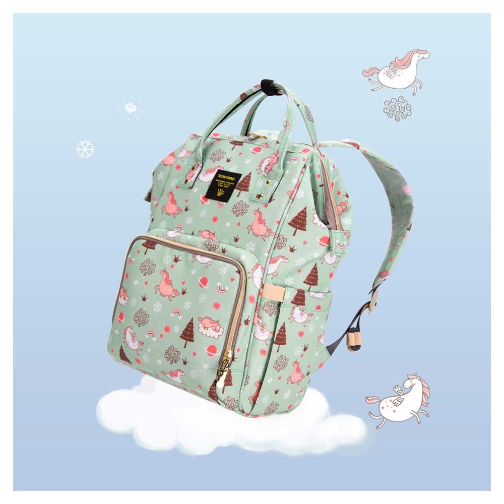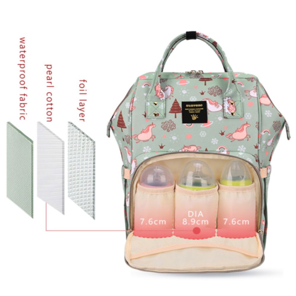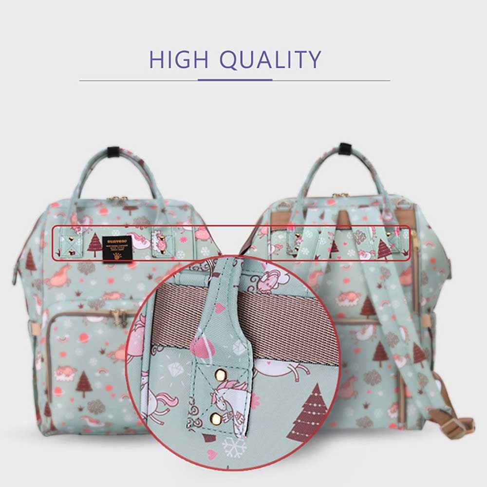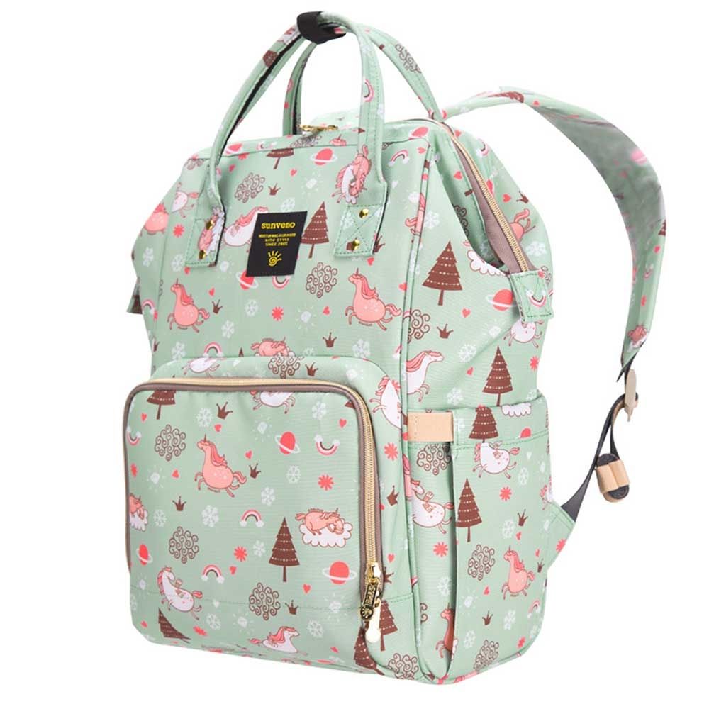 For the stylish and traveller mom's, this choice is the best. This sunveno diaper bag green dream sky comes with beautiful colors to make this extremly spacious bag, turn heads around. The wide zipper opening with metal support and beautifully crafted golden zippers give this bag a royale look. Despite all the space and accessories, this a light weight bag weighing only 750 gms, not even a kg! The unique features being the back opening zipper and tissue/wipes holder side pocket, both of these allow you easy access when you need tissues and clothes handy. A key chain holder helps you to access your house and car keys, when your one hand is busy carrying your little munchkin. Use it for twins or siblings, you would love to pack your bags on the go! The new version has the anti-theft pocket with beautiful prints. Elegant and beautiful bag will make you fall in love with it