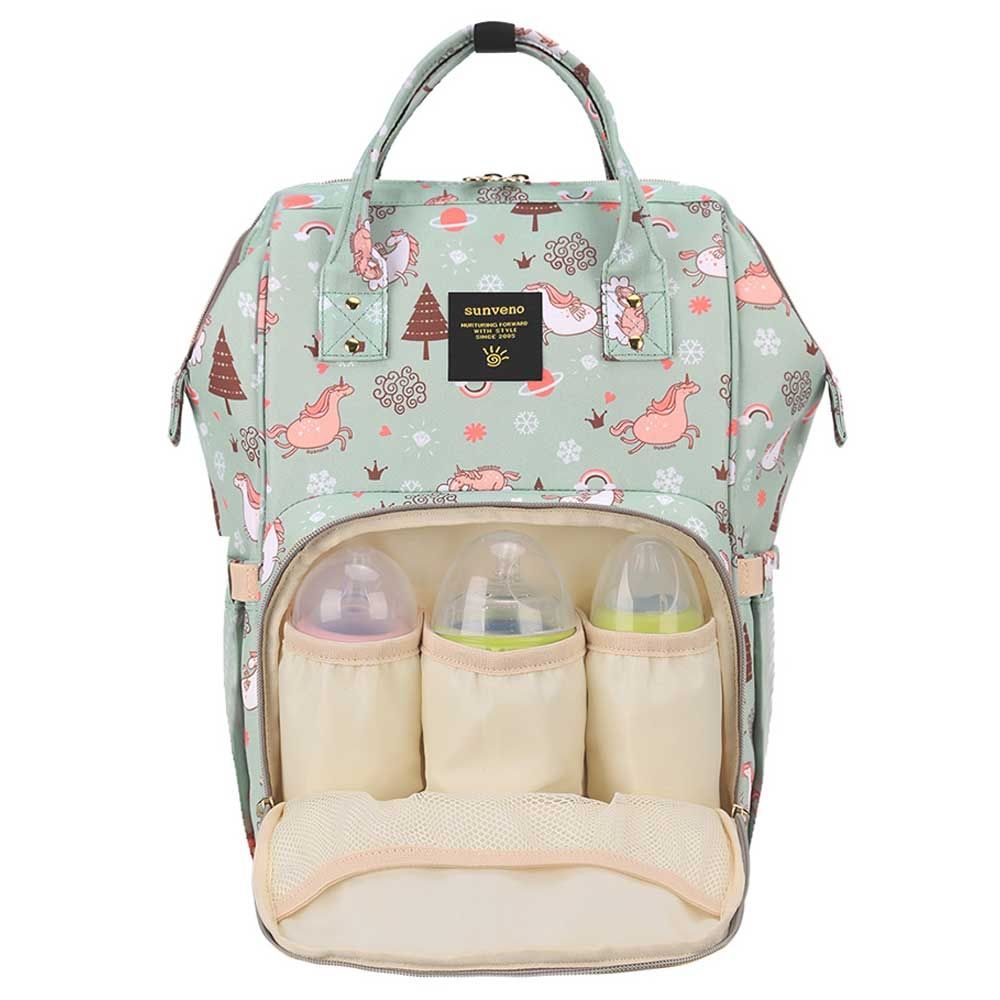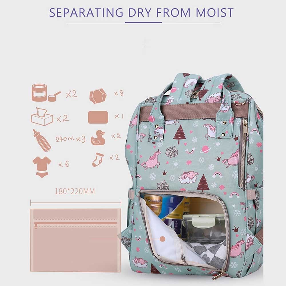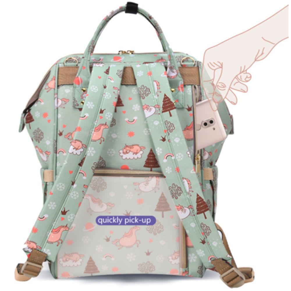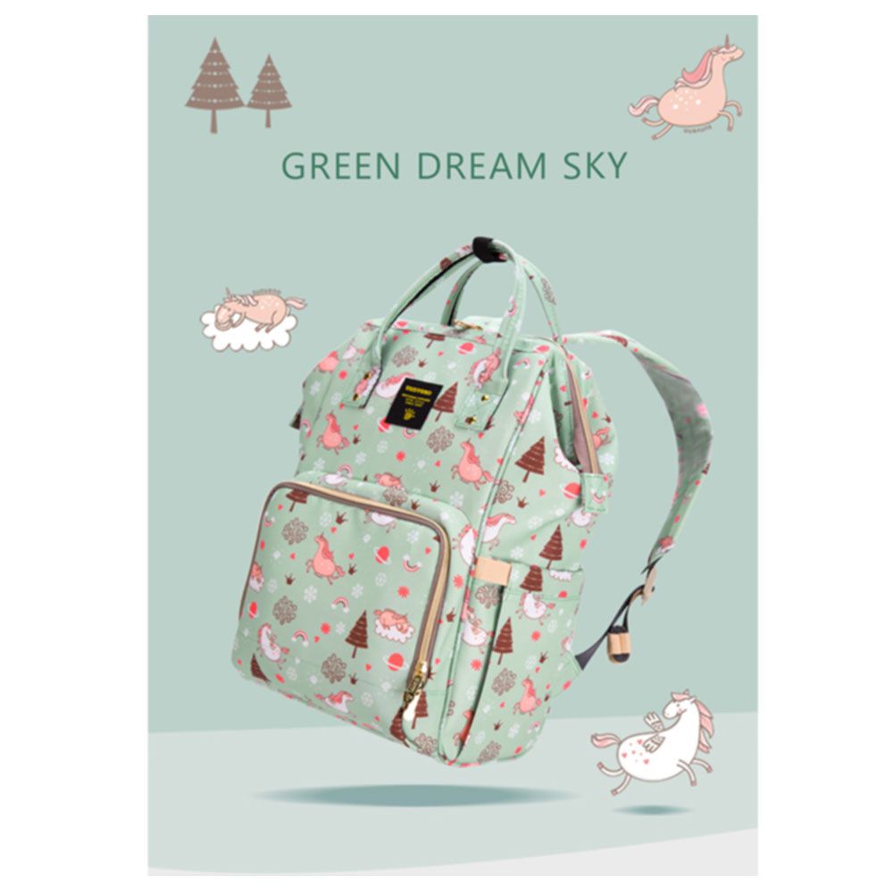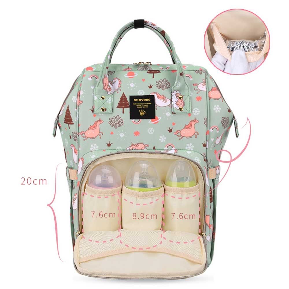 For the stylish and traveller mom's, this choice is the best. This sunveno diaper bag green dream sky comes with beautiful colors to make this extremly spacious bag, turn heads around. The wide zipper opening with metal support and beautifully crafted golden zippers give this bag a royale look. Despite all the space and accessories, this a light weight bag weighing only 750 gms, not even a kg! The unique features being the back opening zipper and tissue/wipes holder side pocket, both of these allow you easy access when you need tissues and clothes handy. A key chain holder helps you to access your house and car keys, when your one hand is busy carrying your little munchkin. Use it for twins or siblings, you would love to pack your bags on the go! The new version has the anti-theft pocket with beautiful prints. Elegant and beautiful bag will make you fall in love with it
