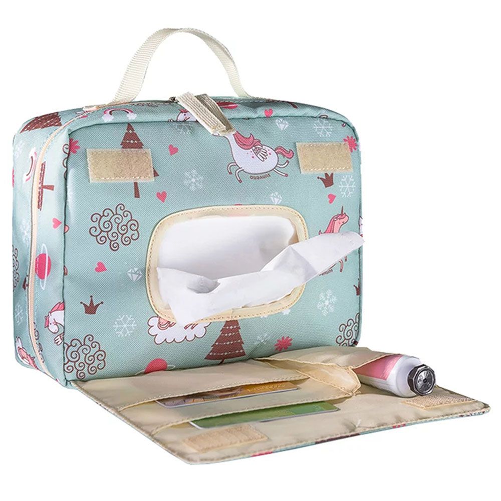 - Side pockets hold your water bottle and include a tissue dispenser slot so wipes and tissues are always within reach. Comes with a Diaper Changing Clutch Kit and Wet Dry Bag.