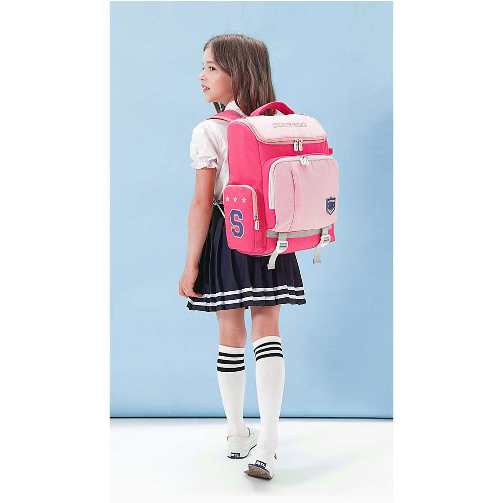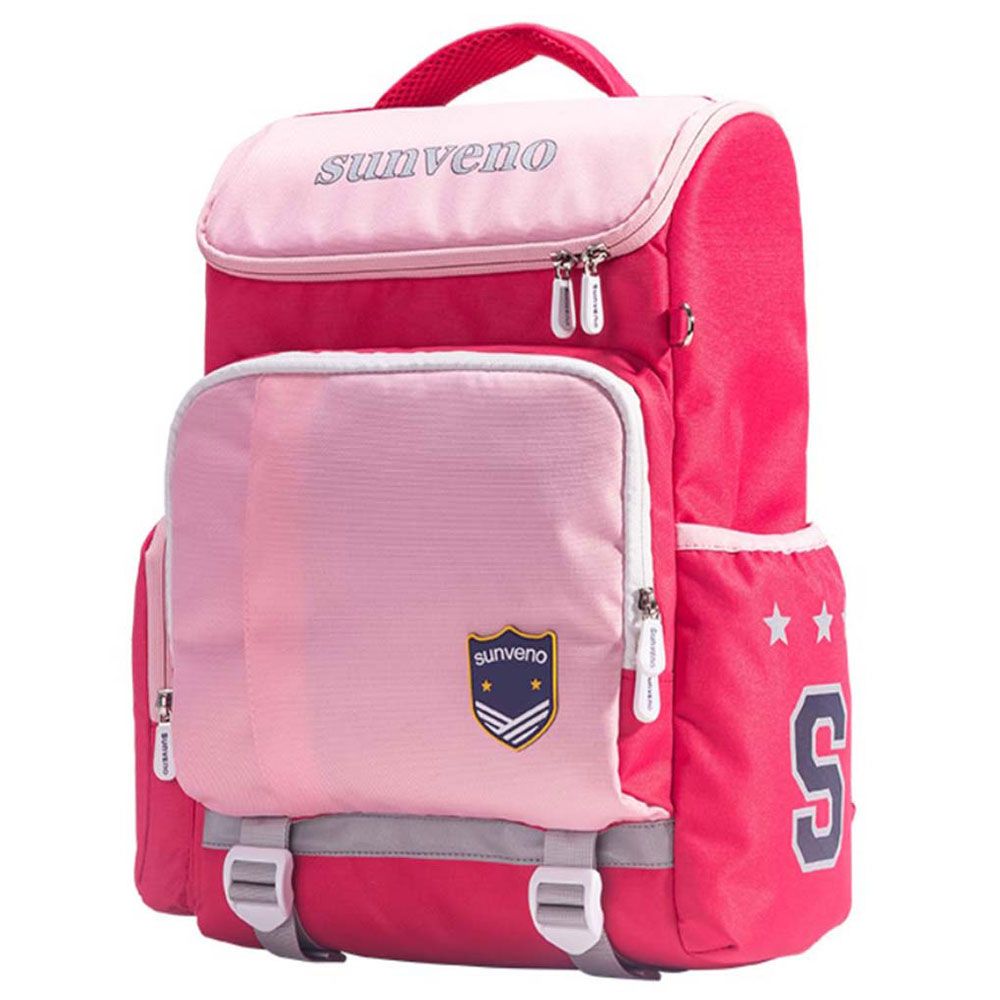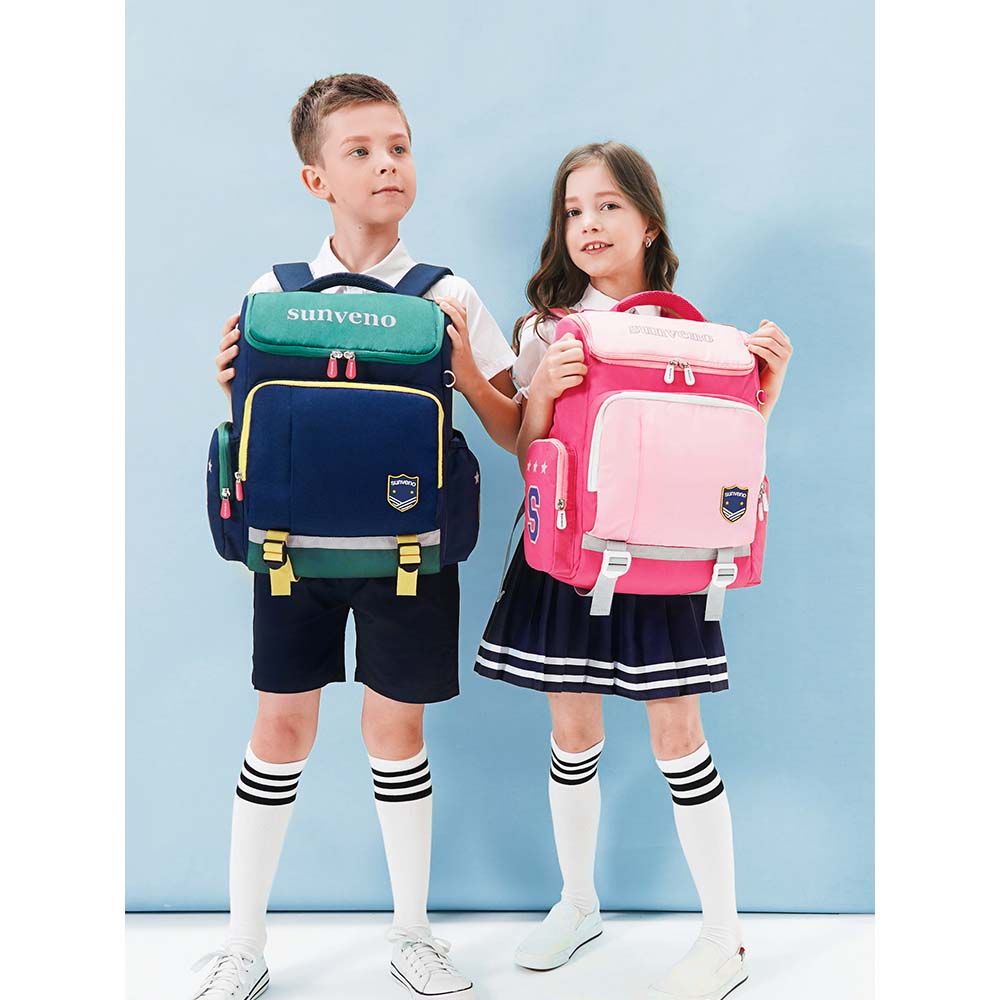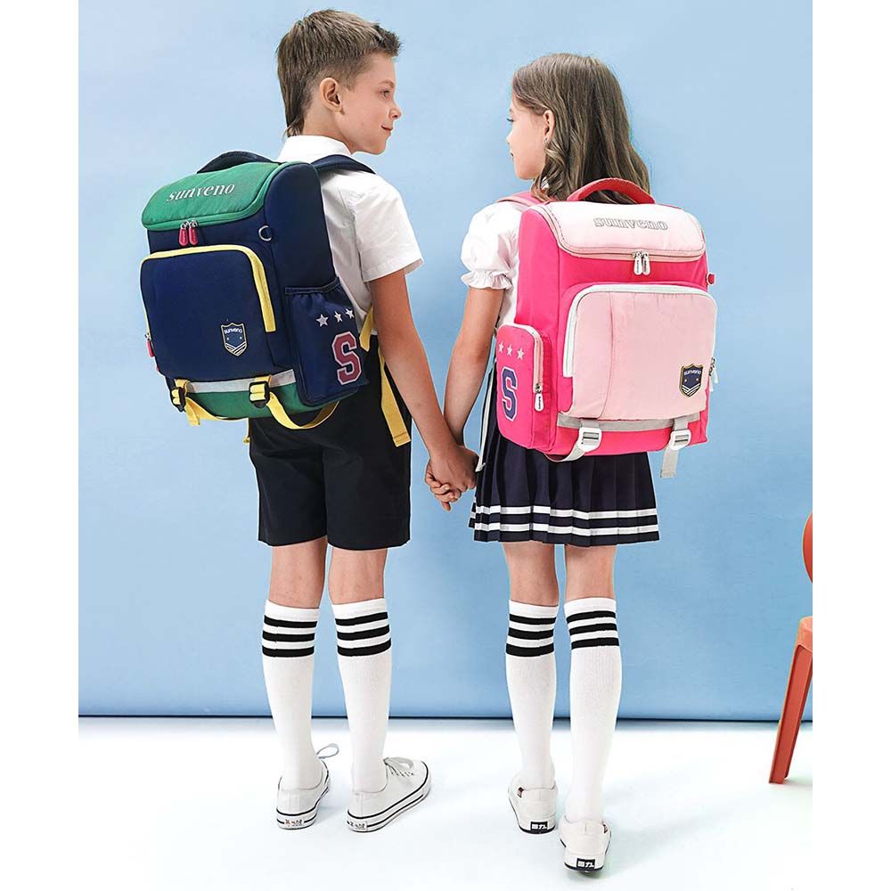 Our Sunveno School Bag series of backpacks carry the same lineage of Style and Functionality, Sunveno is known for. The beautiful design of the front pocket is unique to keep things for easy access. They come with a ID card holder keychain. This backpack has multiple storage compartments and pockets keep everything in its place; Zippers are solid and sturdy, they don't easily break off even with constant use, pullers have a firm grip so sliding the zipper to open or close is easy. These bags are Water - resistant and water proof. The erect stature of the bag makes it ways to take out books and i - pads at the same time keep them safe and in shape. The best feature is the Safety Light Reflecting Strips on the bag, which reflects light and shine in night, very important for your Kids safety. The bottom has belts is like a webbing to maintain the load of the bag to bear the maximum load on bottom and not the child. Extra wide cushioned shoulder straps and S - shape back padding ensures very less load on the kids back. Lovely colors and prints and a great gift for back to school.