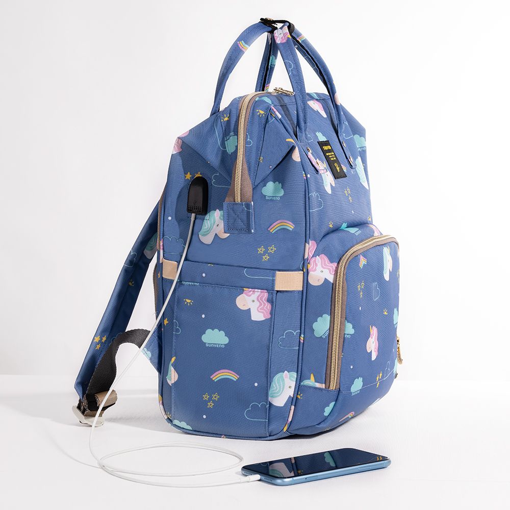 For the Stylish and Traveller Mom's, the same favourite Sunveno diaper Bag with a USB Port. Now you can charge phone with a powerbank,while your phone is outside the bag. This Sunveno diaper bag comes with beautiful colors to make this extremely spacious bag, turn heads around. The wide zipper opening with metal support and beautifully crafted golden zippers give this bag a royale look. Despite all the space and accessories, this a light weight bag weighing only 820 gms, Not even a Kg! The unique features being the back opening zipper and tissue/wipes holder side pocket, both of these allow you easy access when you need tissues and clothes handy. A key chain holder helps you to access your house and car keys, when your one hand is busy carrying your little munchkin. Use it for twins or siblings, you would love to pack your bags on the go