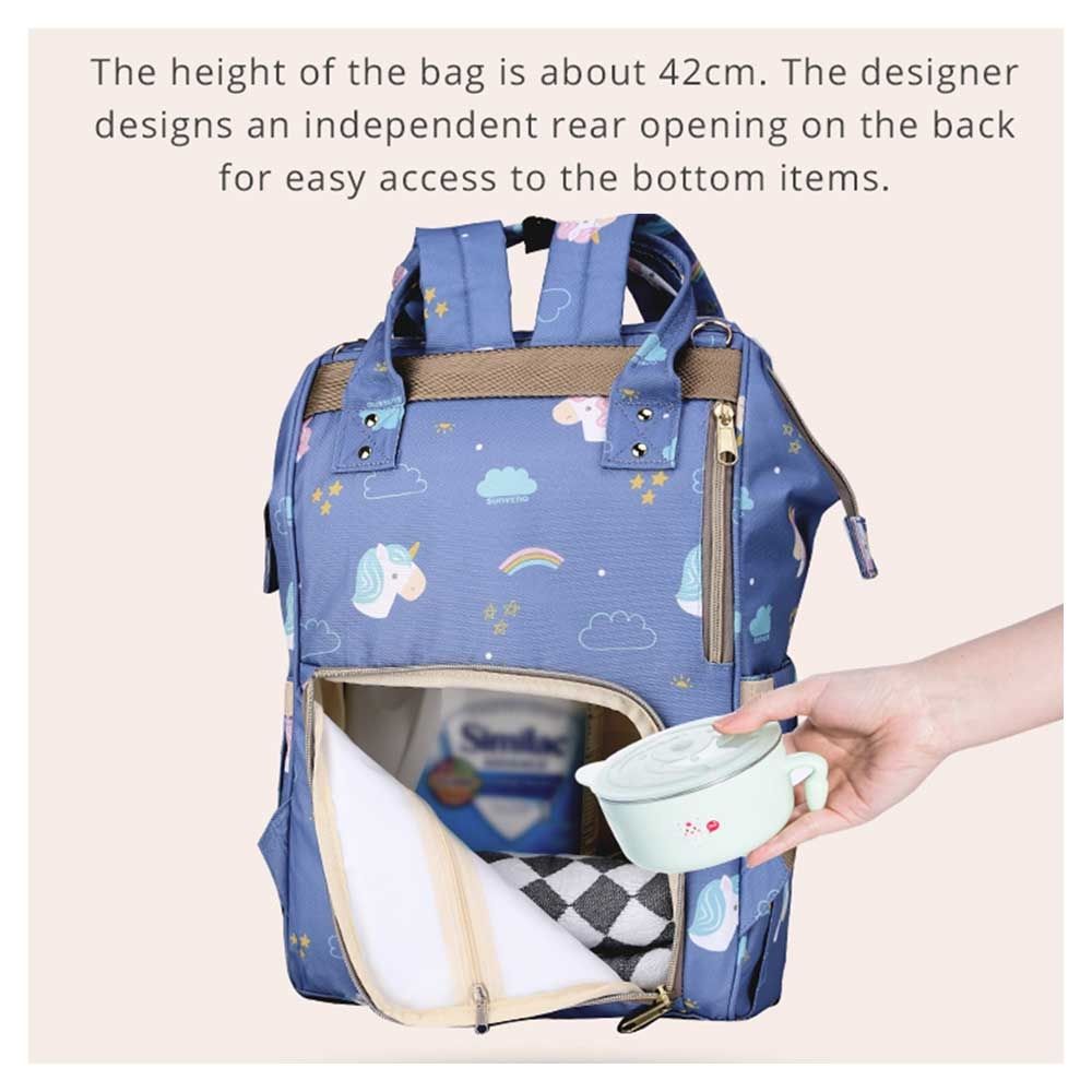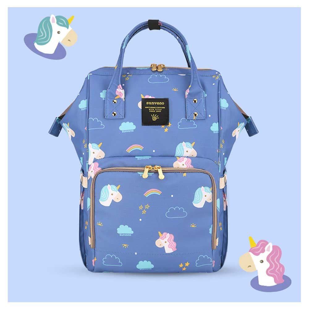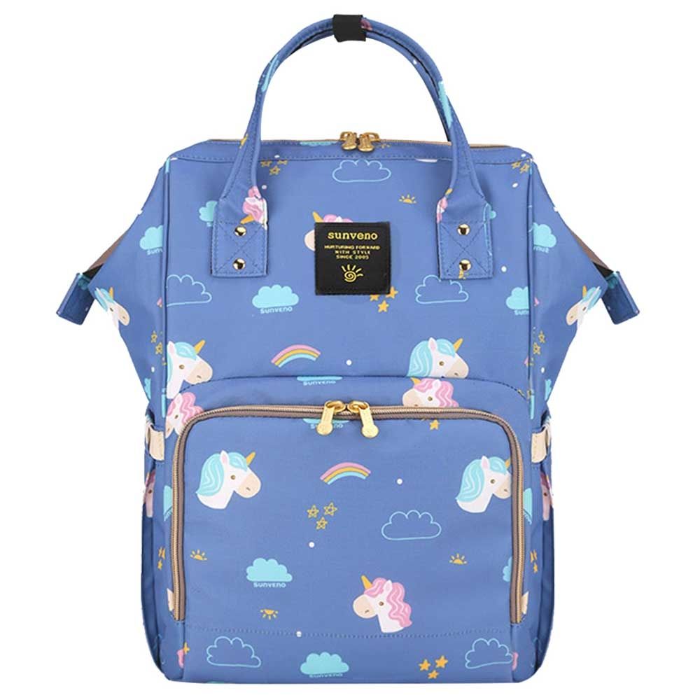 For the Stylish and Traveller Mom's, this Unicorn Diaper Bag is the best. This Sunveno diaper bag comes with beautiful unicorn print and a lovely subtle blue color to make this extremely spacious bag, turn heads around. The wide zipper opening with metal support and beautifully crafted golden zippers give this bag a royal look. Despite all the space and accessories, this a light weight bag weighing only 750 gms, not even a Kg. The unique features being the back opening zipper and tissue/wipes holder side pocket, both of these allow you easy access when you need tissues and clothes handy. A key chain holder helps you to access your house and car keys, when your one hand is busy carrying your little munchkin. Use it for twins or siblings, you would love to pack your bags on the go