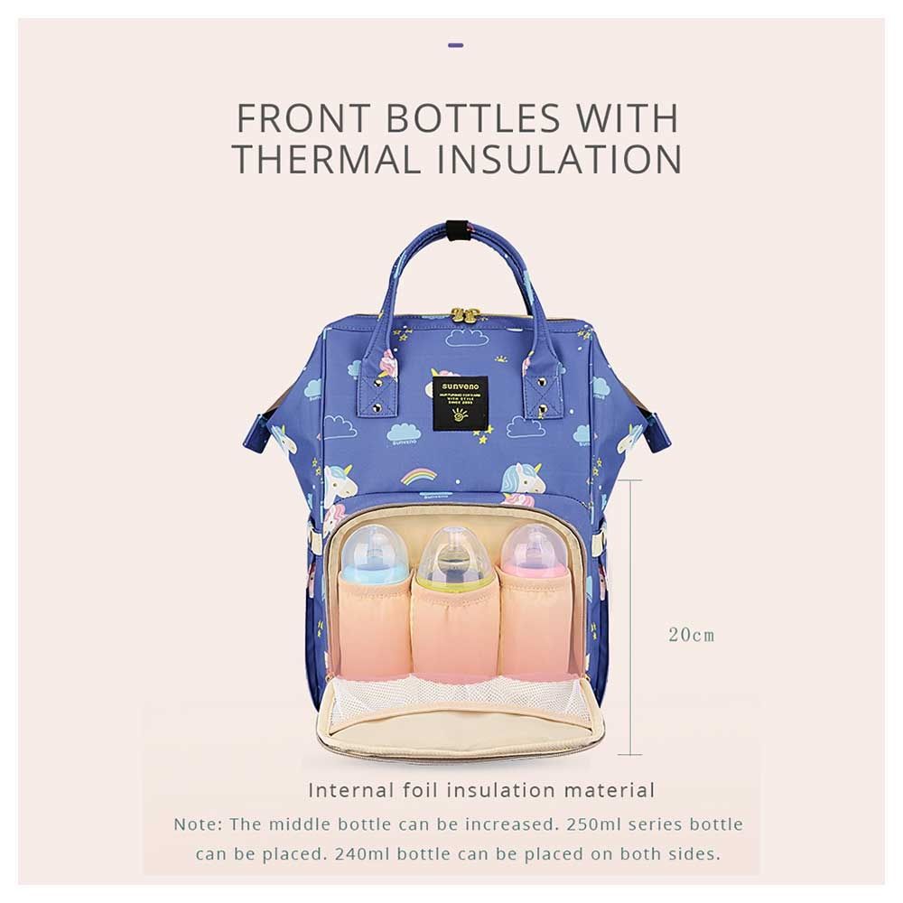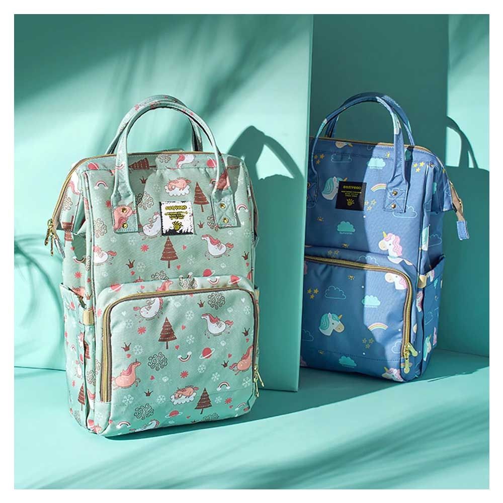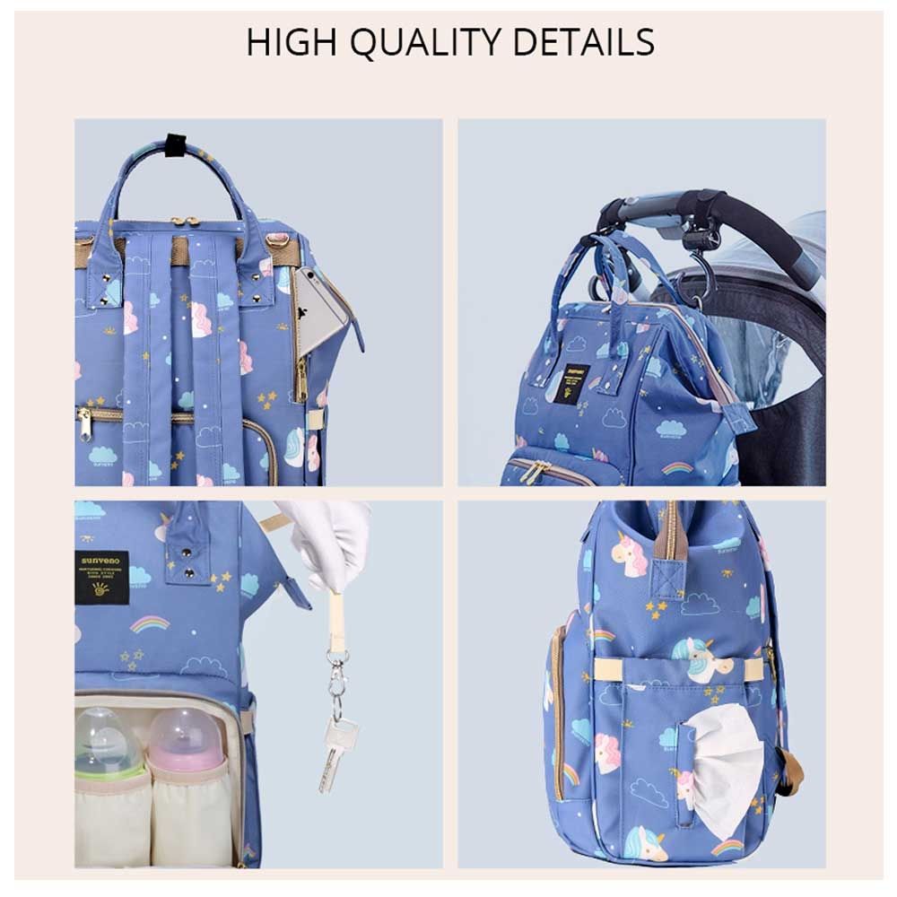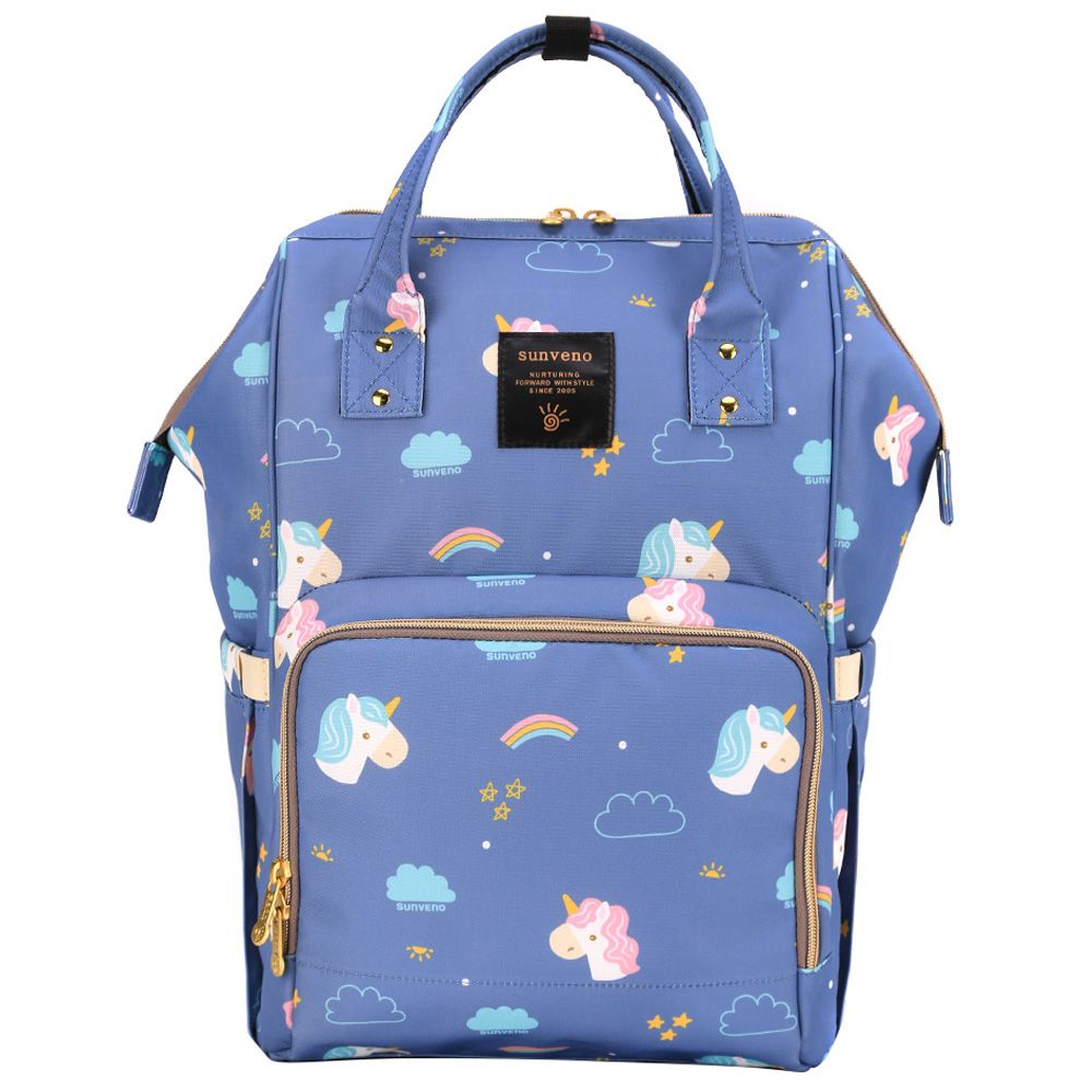 For the Stylish and Traveller Mom's, this Unicorn Diaper Bag is the best. This Sunveno diaper bag comes with beautiful unicorn print and a lovely subtle blue color to make this extremely spacious bag, turn heads around. The wide zipper opening with metal support and beautifully crafted golden zippers give this bag a royal look. Despite all the space and accessories, this a light weight bag weighing only 750 gms, not even a Kg. The unique features being the back opening zipper and tissue/wipes holder side pocket, both of these allow you easy access when you need tissues and clothes handy. A key chain holder helps you to access your house and car keys, when your one hand is busy carrying your little munchkin. Use it for twins or siblings, you would love to pack your bags on the go