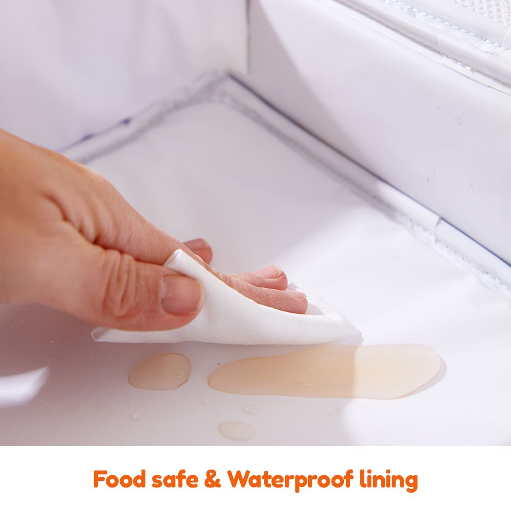 - Spacious & Organized: With a capacity of 5.5L, the main compartment includes a zipper mesh pocket for storing cutlery or other essentials, and a gripped meshed side bottle pocket adds extra convenience. Additionally, a zipper front pocket provides storage for tissues or small items.