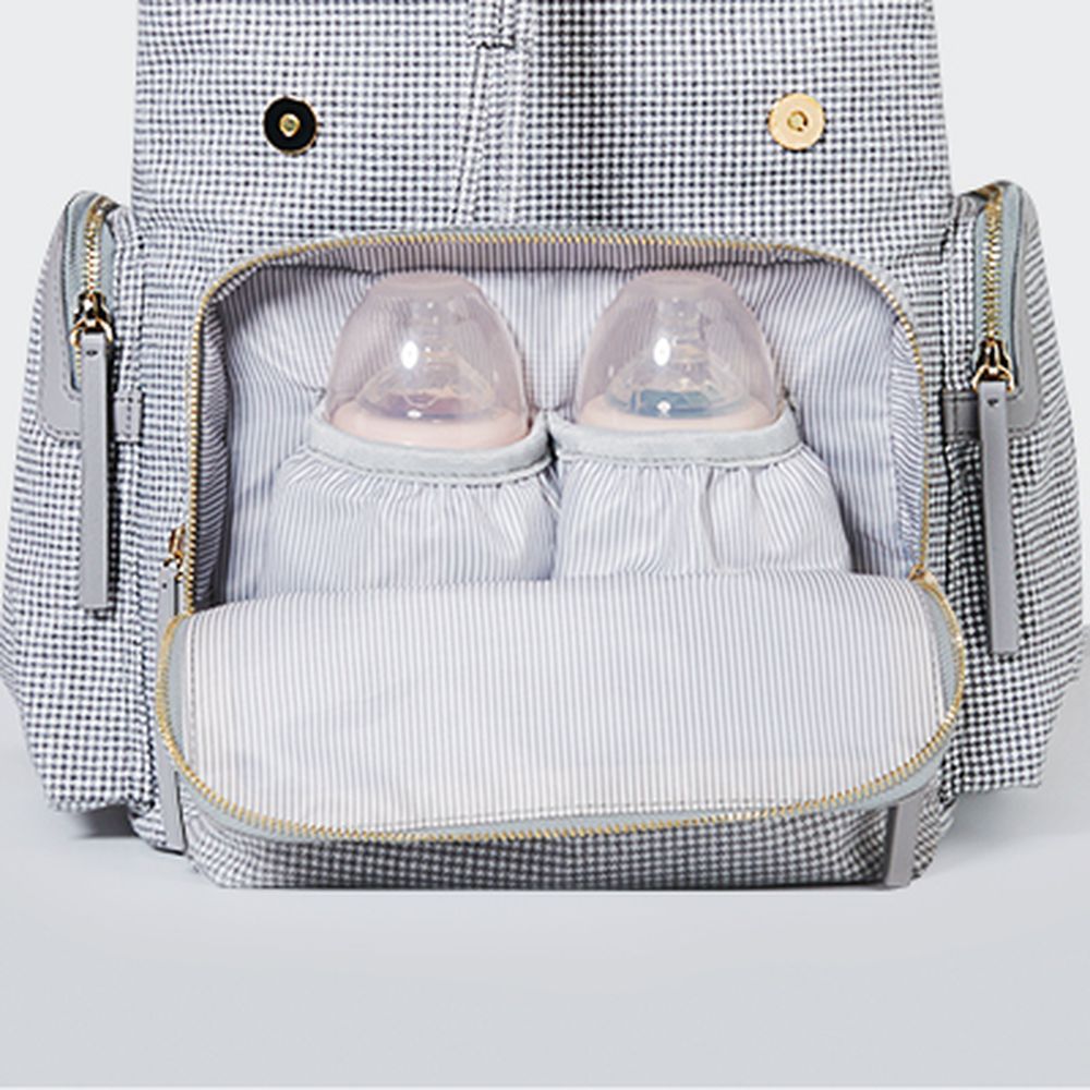 - Separate Milk bottle holder: 2 insulated bottle holders in the front of the bag, separated from other baby items. These 2 holders with insulation layer of tin foil can keep warm or cold for about 2 - 4 hours. Milk bottles of various brands can fit in be it wide neck or slim neck.