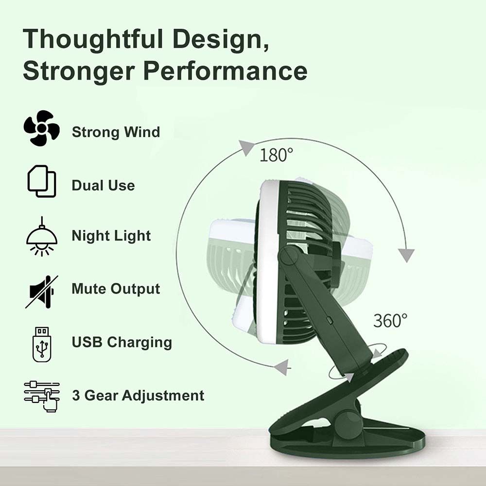 Teknum 2-in-1 Stroller USB Charging Fan with Light comes with 360 degree rotation support, the Fan head can be adjusted freely in any direction to ensure that children get fresh air during summer travel & Universal Clip stand comes with high-quality knob design with rubber coating inside the fixture prevents scratches on the frame. Silent and Convenient to use, suitable for most frames. Made with high-quality Material with the strongest frame provides a long life. , , Universal Design easily attaches to the side of any Stroller, Golf Cart, Wheelchair, Walker, Balcony Chairs, Deck Chair or Scooter tricycle, fishing chair, bicycle, dog stroller, etc. by a simple base Clip. Easy to fold, compact, convenient to carry, Comes with 1200mAh Lithium battery with USB charging , works for 120 to 180 min