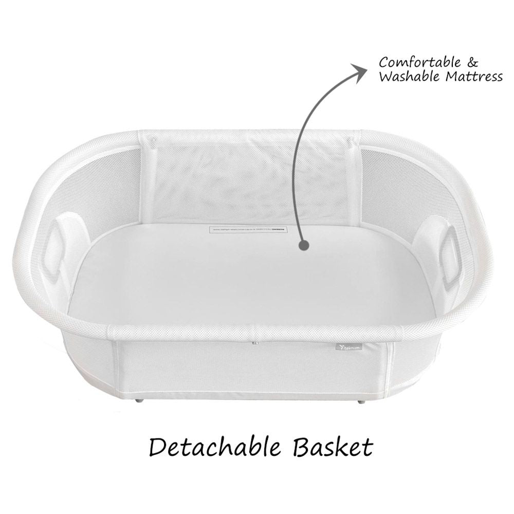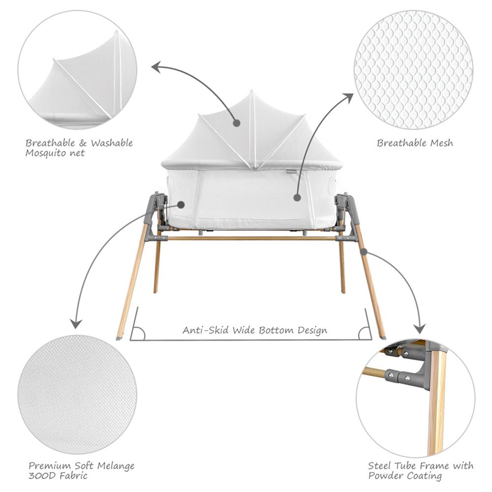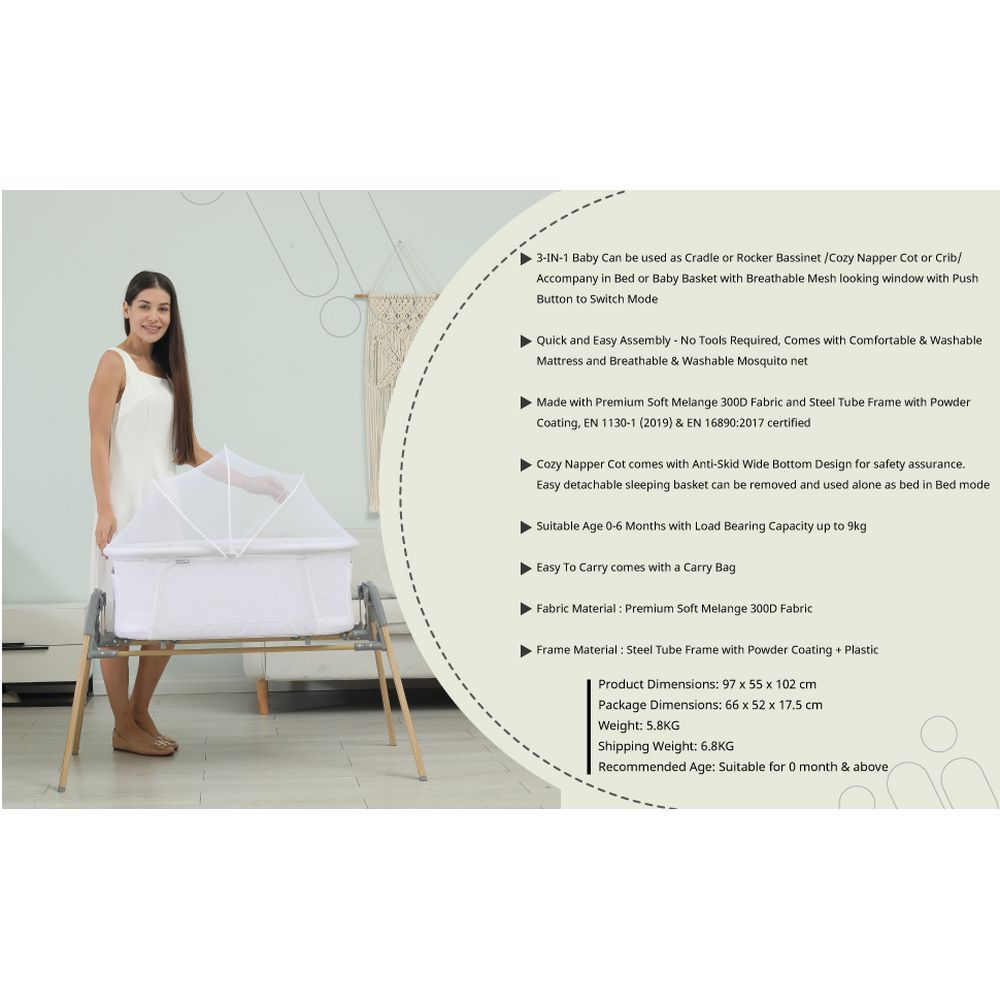 Teknum 3-in-1 Baby Cradle Bassinet/ Infant Cot can be used as Cradle or Rocker Bassinet /Cozy Napper Cot or Crib/ Accompany in Bed or Baby Basket with Breathable Mesh looking window for your baby with Push Button to Switch Mode from Rocker to bassinet mode. The movement of the Cradle Rocker is so smooth that your little ones will literally feel that they are in your arms. Quick and Easy Assembly - No Tools Required, Comes with Comfortable & Washable Mattress and Breathable & Washable Mosquito net, Baby Rocker Bassinet is made with Premium Soft Melange 300D Fabric and Steel Tube Frame with Powder Coating. Cozy Napper Cot comes with Anti-Skid Wide Bottom Design for safety assurance. Easy detachable sleeping basket can be removed and used alone as bed in Bed mode. Suitable Age 0-6 Months with Load Bearing Capacity up to 9kg. Easy To Carry comes with Free Carry Bag, Easy to Store and a Great gift for baby shower to get back mother's delicate sleep, giving the baby a comfortable space to sleep naturally.