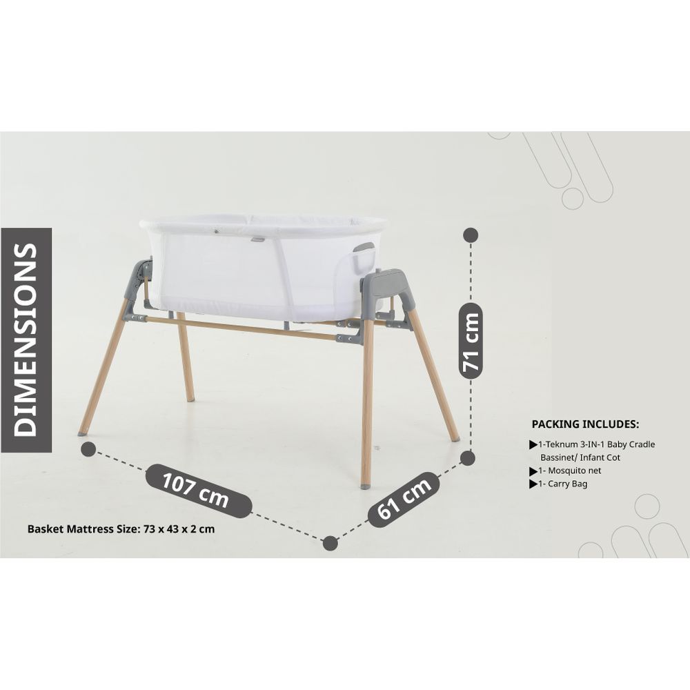 Packing Includes:, - 1-Teknum 3-in-1 Baby Cradle Bassinet/ Infant Cot, - 1- Mosquito net, - 1- Carry Bag