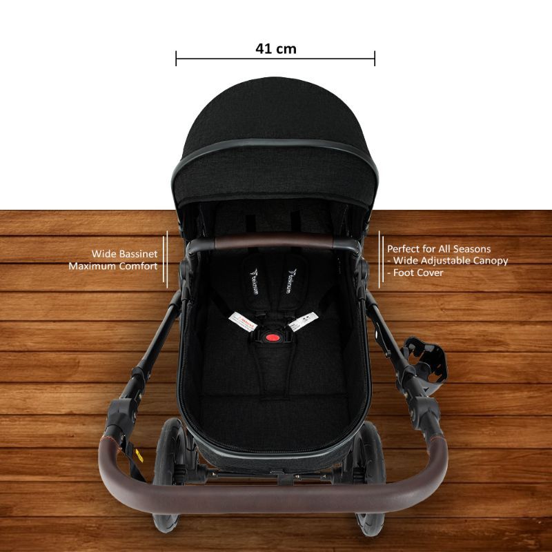 Experience the perfect blend of functionality and style with the Teknum 3-in-1 Compacto Travel Stroller. Designed for modern parents, this stroller features a high-view seat with a multi-recline function, converting into a bassinet for newborns. Despite its spacious design, it folds into a compact size suitable for airplane cabins. The 7-inch front and 12-inch rear TPE wheels provide smooth maneuverability, while the five-point safety harness ensures your child's security. Additional features include a linen canopy, foot cover, mosquito net, coffee cup holder, and a generous shopping basket.
