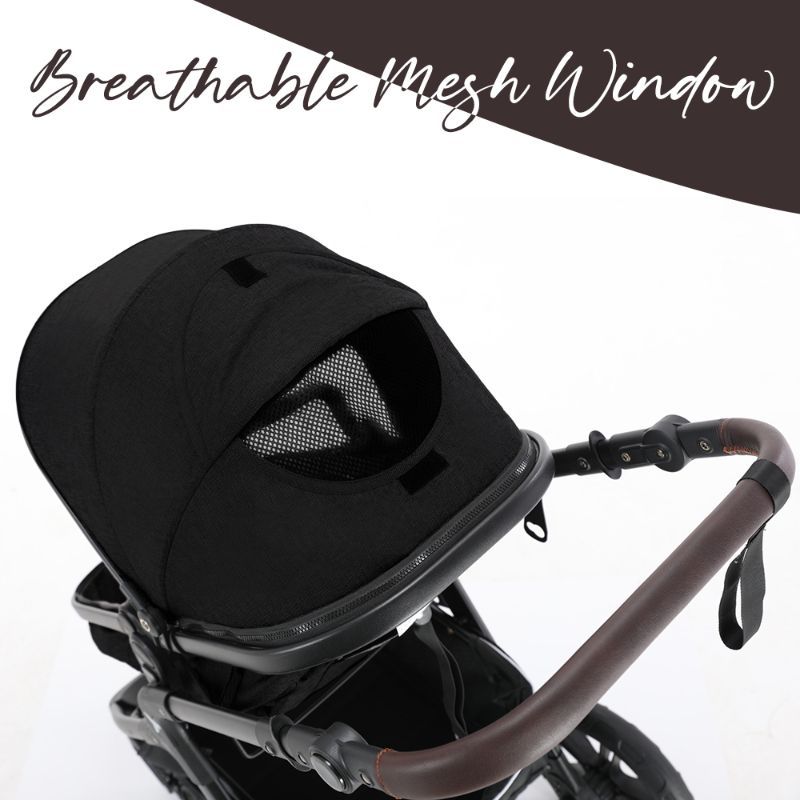 - The linen canopy is adjustable to shield the baby from various weather conditions.