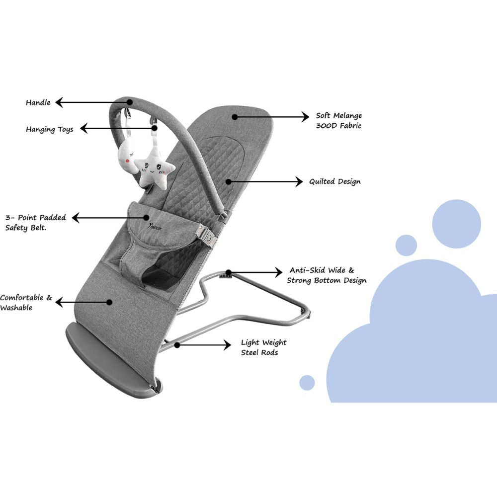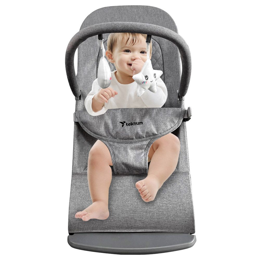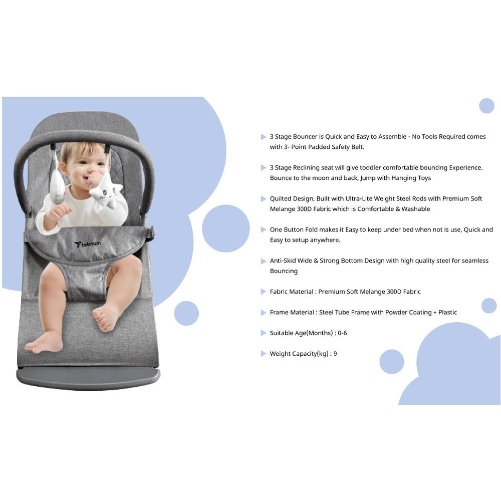 Keep your baby entertained and comfortable with the Teknum 3-Stage Baby Bouncer . This thoughtfully designed bouncer features a 3-stage reclining seat, catering to your baby's needs from playtime to naptime. The quilted design, crafted with ultra-lightweight steel rods and premium soft melange 300D fabric, offers both comfort and durability. A one-button fold mechanism allows for easy storage under the bed, while the anti-skid wide and strong bottom ensures stability. The bouncer includes a 3-point padded safety belt and hanging toys to enhance your baby's motor skills. Quick to assemble with no tools required, it's perfect for gifts to new moms or baby showers.