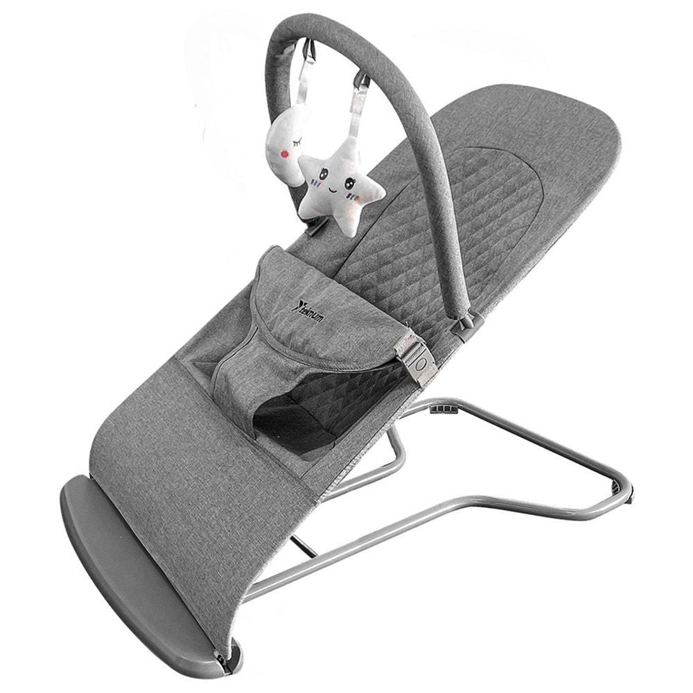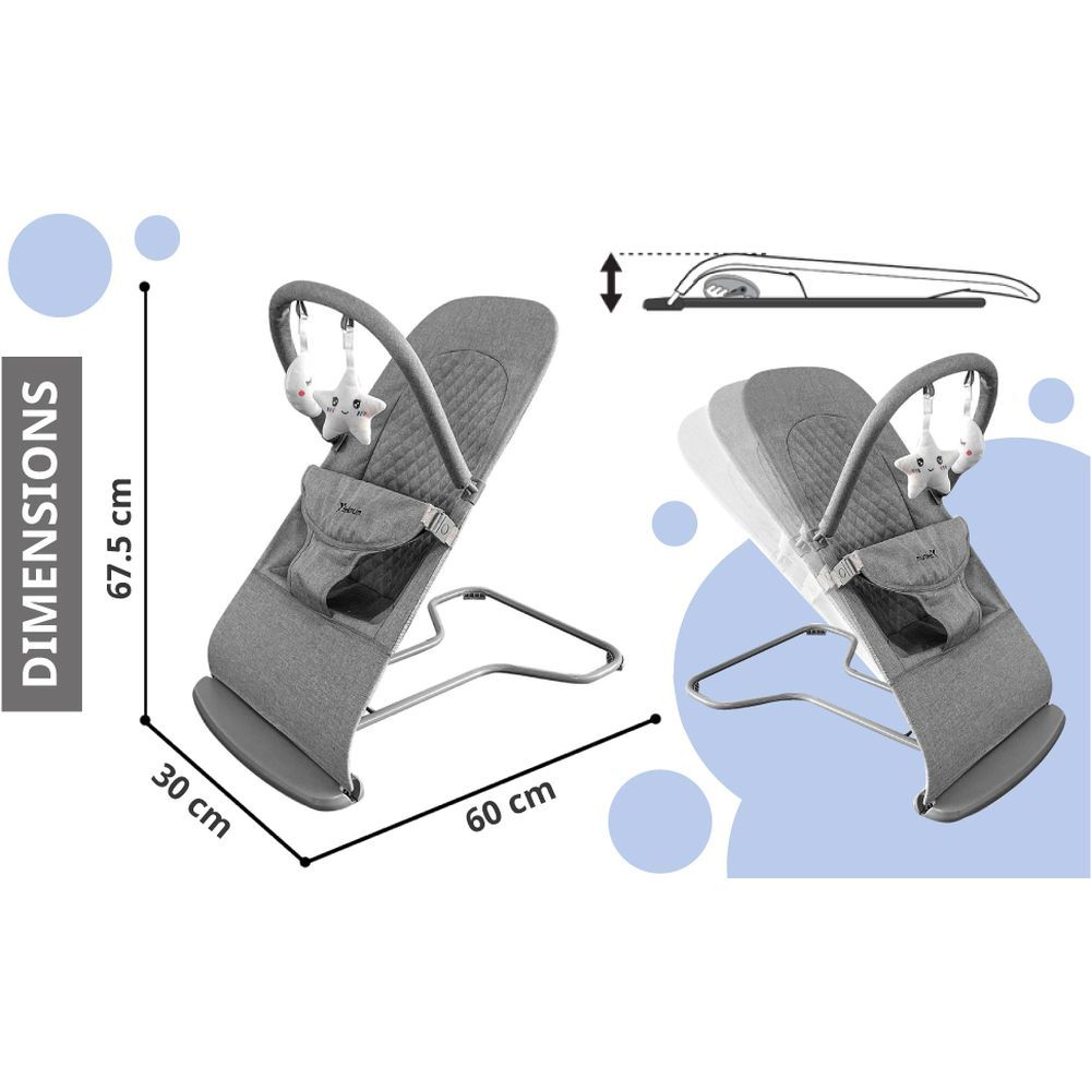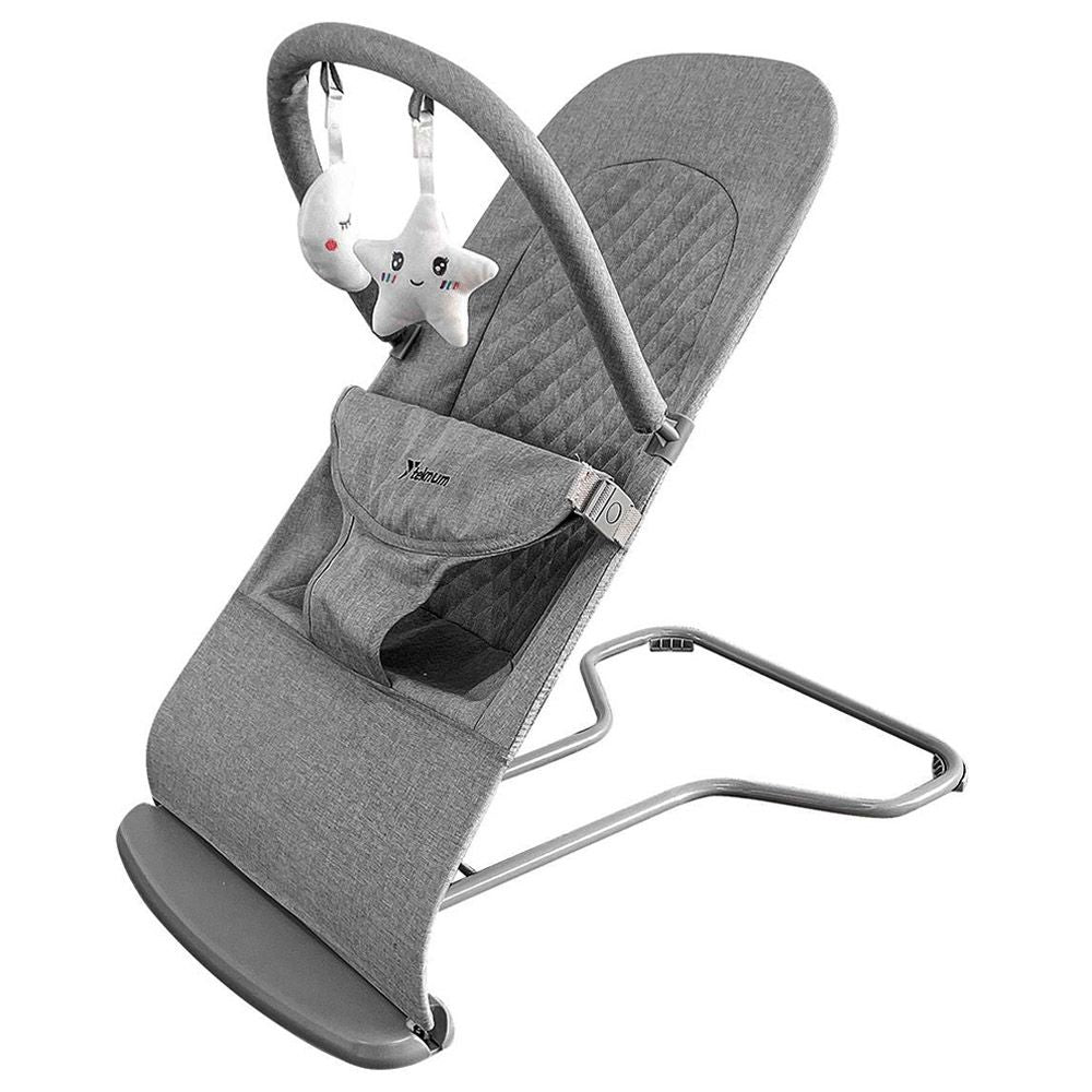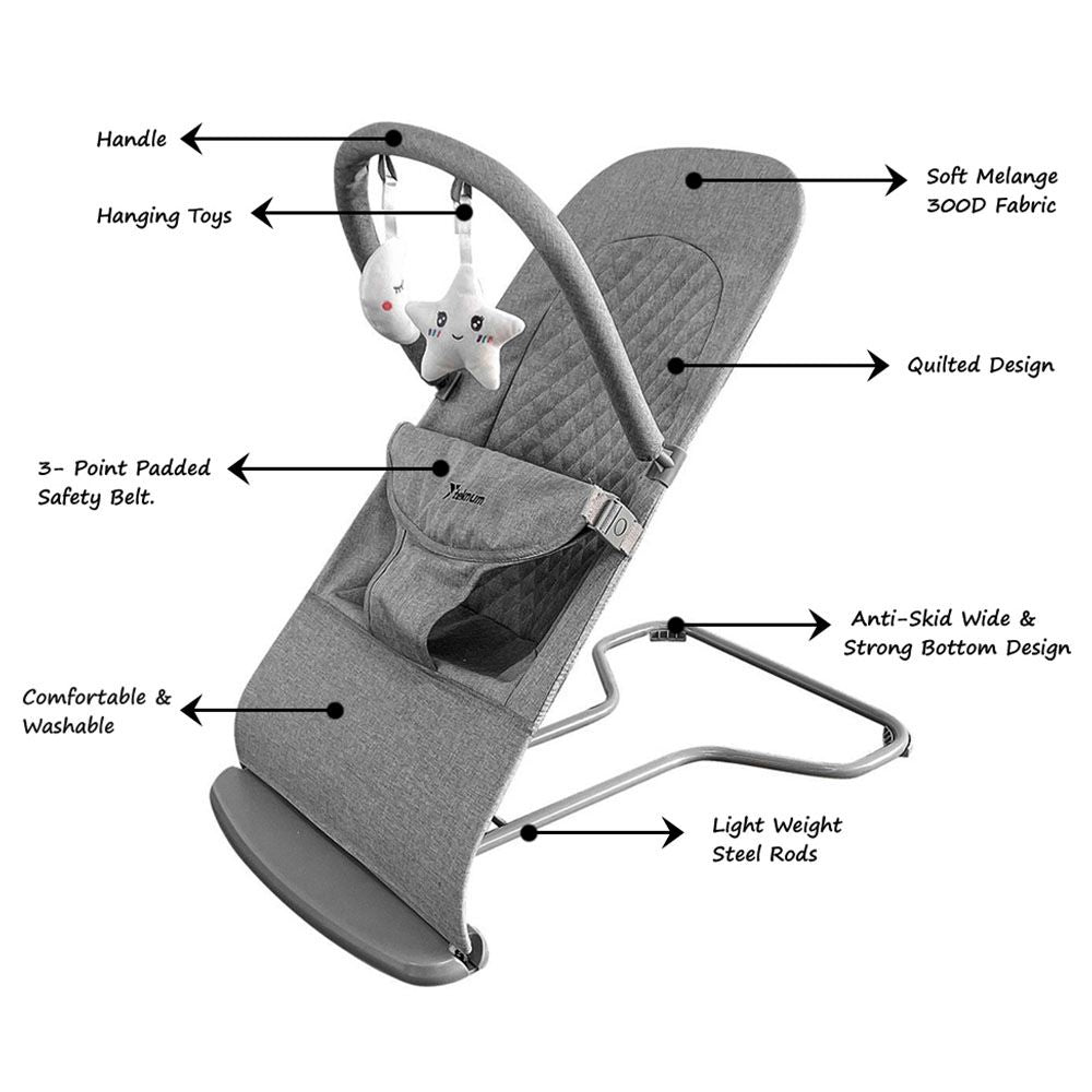 Keep your baby entertained and comfortable with the Teknum 3-Stage Baby Bouncer . This thoughtfully designed bouncer features a 3-stage reclining seat, catering to your baby's needs from playtime to naptime. The quilted design, crafted with ultra-lightweight steel rods and premium soft melange 300D fabric, offers both comfort and durability. A one-button fold mechanism allows for easy storage under the bed, while the anti-skid wide and strong bottom ensures stability. The bouncer includes a 3-point padded safety belt and hanging toys to enhance your baby's motor skills. Quick to assemble with no tools required, it's perfect for gifts to new moms or baby showers.