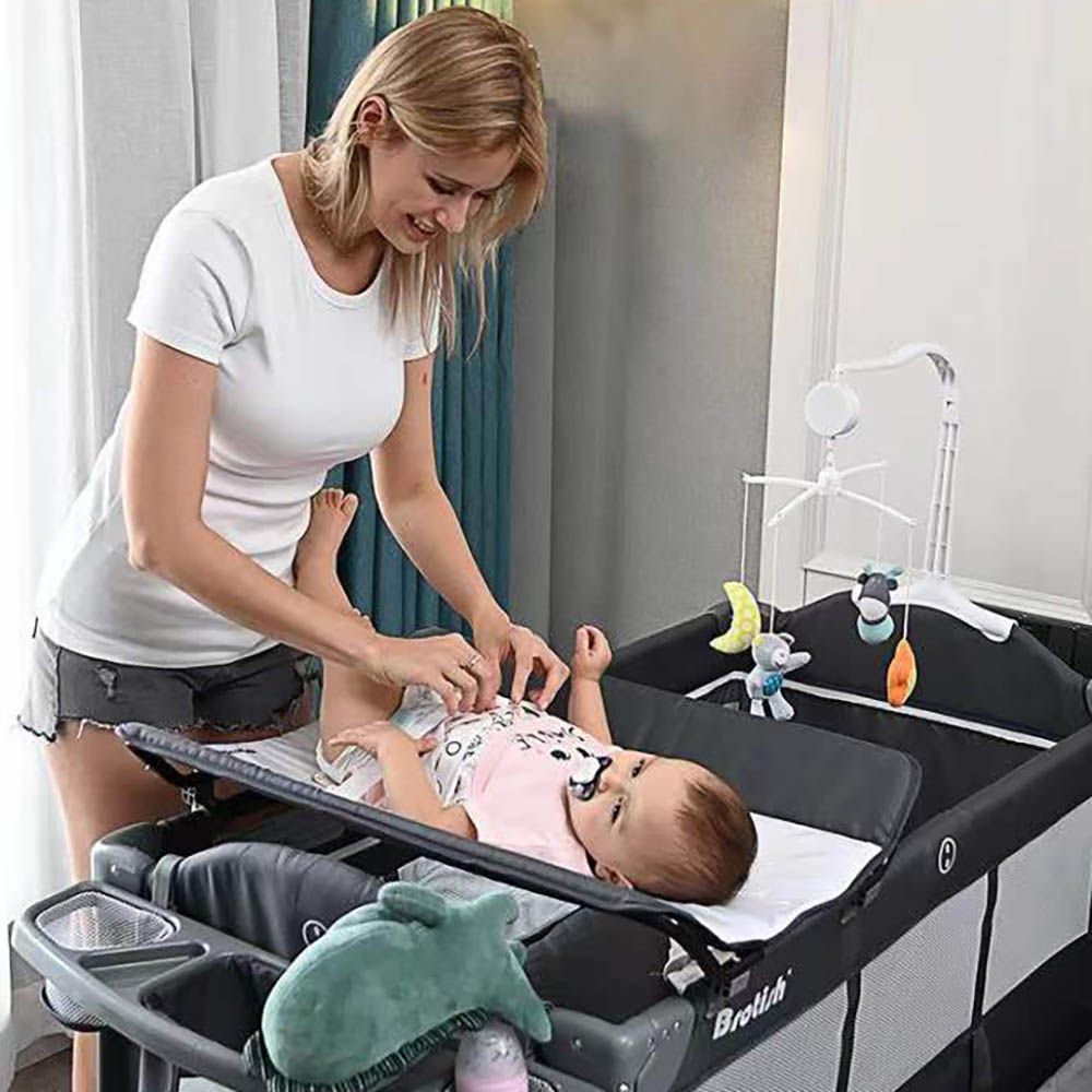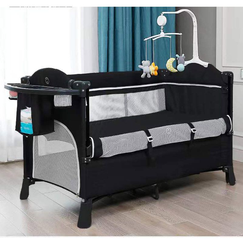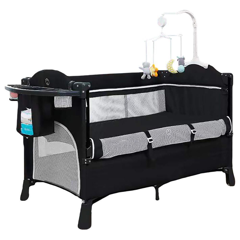 - Multifunctional baby cot serving as a co-sleeper, playard, rocker, and changing station.