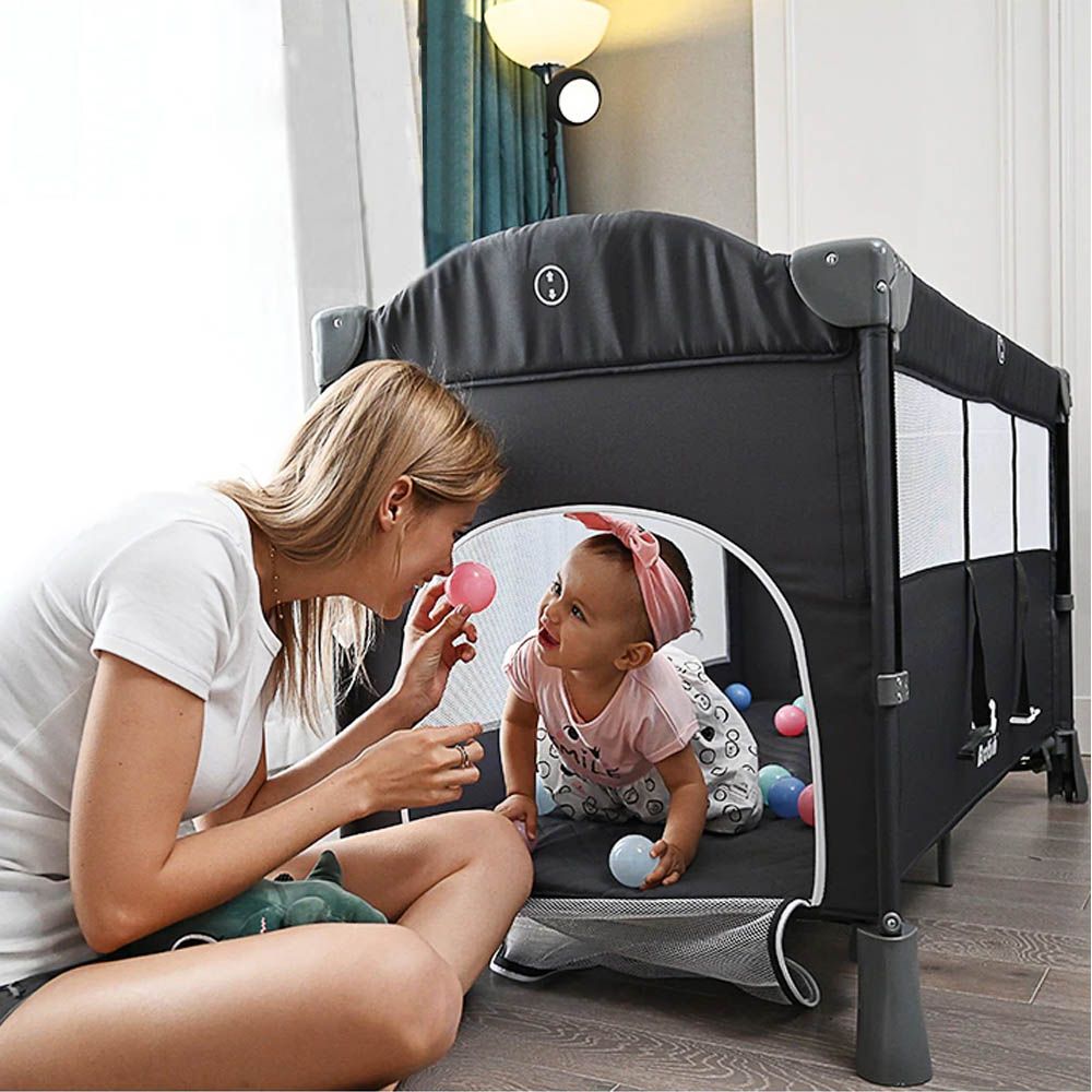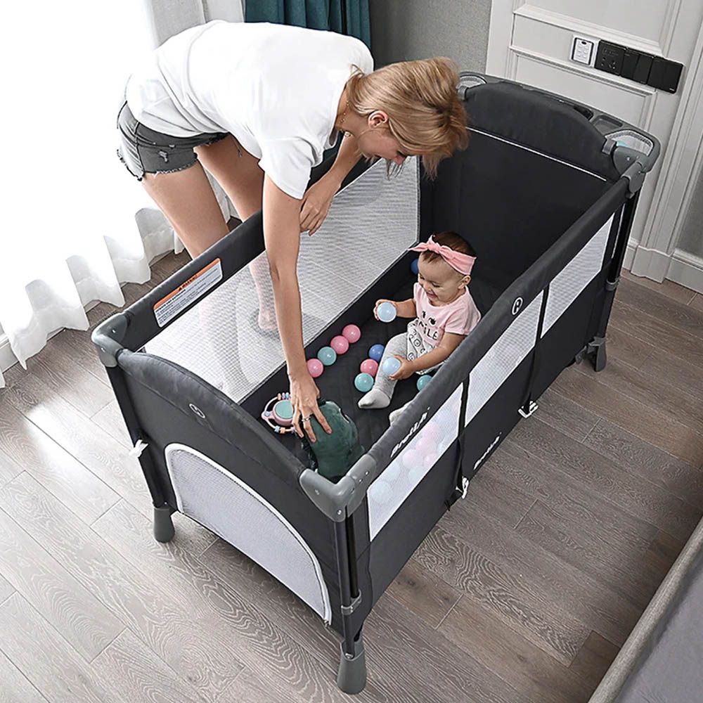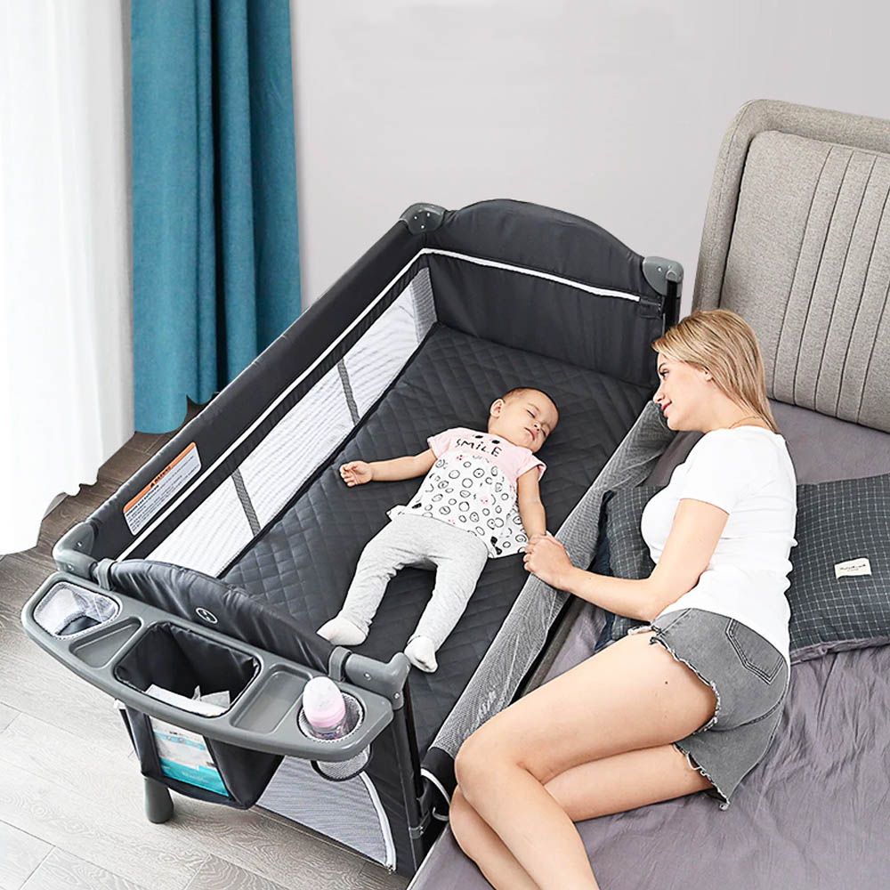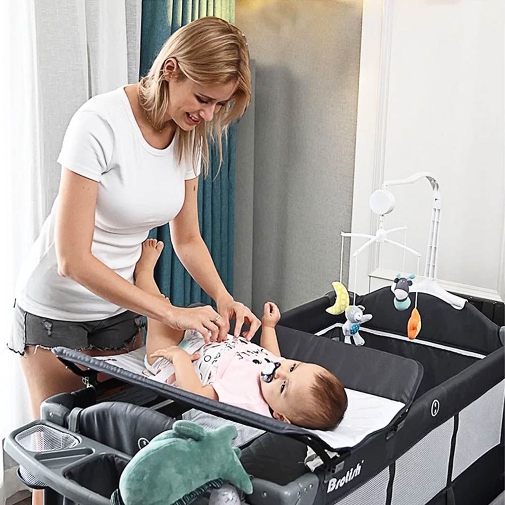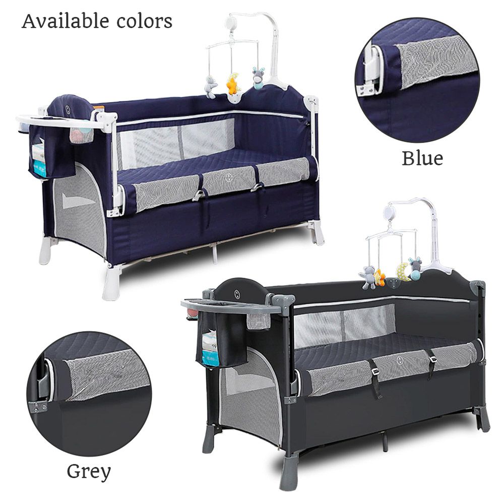 - Multifunctional baby cot serving as a co-sleeper, playard, rocker, and changing station.