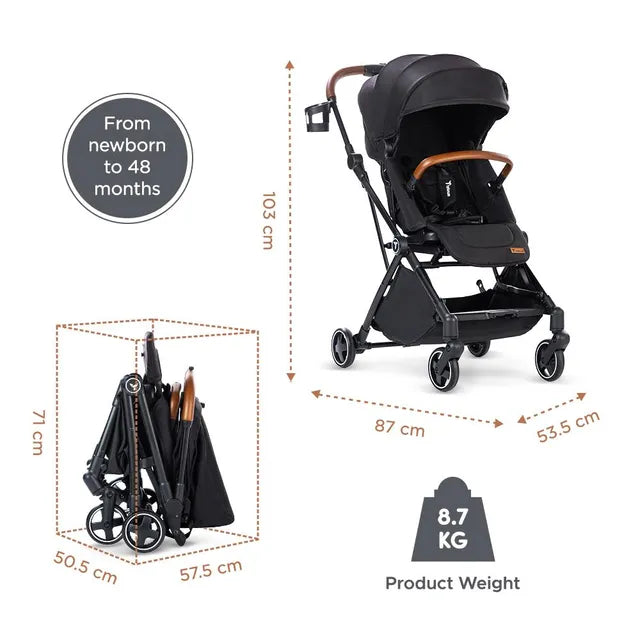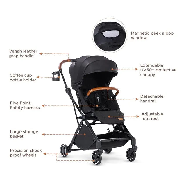 - Durable & Stylish Build: Built with a strong frame and premium Oxford fabric canopy, the stroller is designed to withstand everyday use. PU wheels, handlebar, and all-black color accents give it a sleek, urban aesthetic.