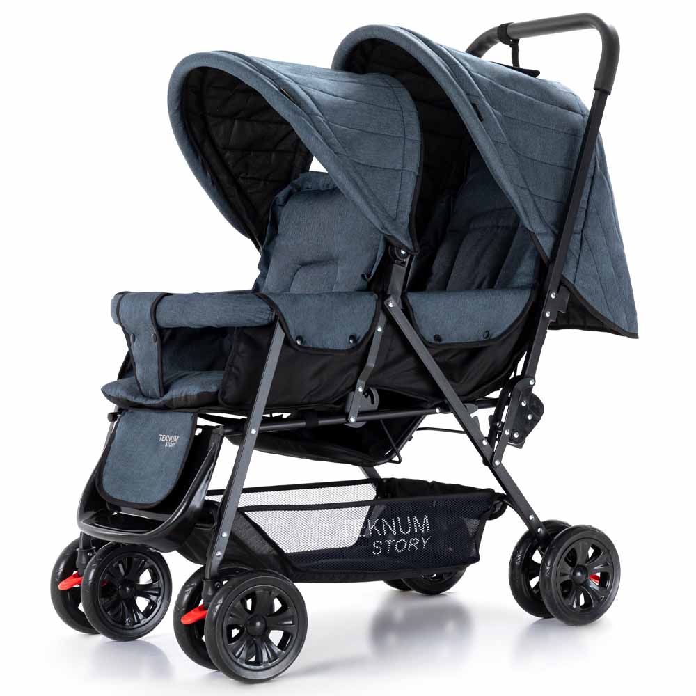 Together we make a lovely Story for you! This Double Stroller by Teknum is perfect to make some memorable stories together as a family. Ideal for twins or siblings, this Stroller is so smooth to ride and slim to pass though the standard gates. The front seat and the back seat can be inclined flat to let the baby sleep comfortably. Made of linen and cushioned seats provide absolute comfort for your little one. A Big Cart basket is enough to carry a lot of items for the twins. Front wheels have smooth swivel and foot activated locks. The Canopy have a transparent cover for the baby to feel comfortable. It's single hand folding system with easy storage while travelling.