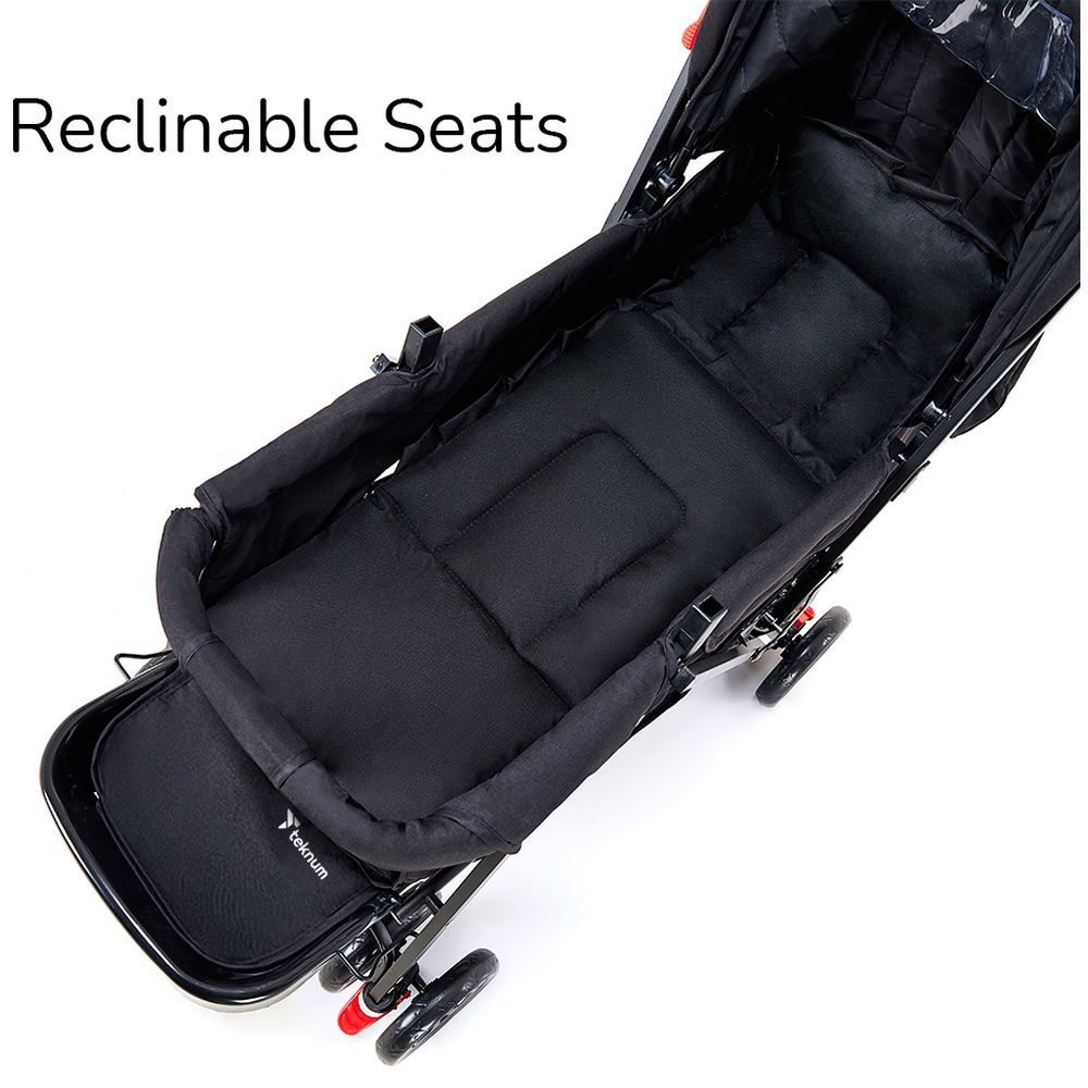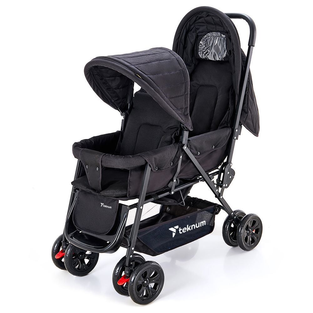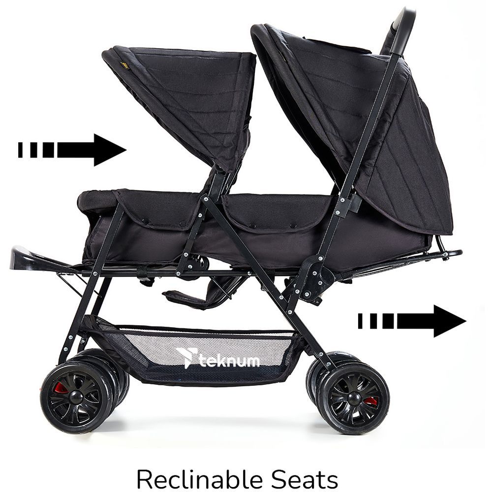 Teknum Double Stroller is perfect to make some memorable stories together as a family. Ideal for twins or siblings, this Stroller is so smooth to ride and slim to pass though the standard gates. The front seat and the back seat can be inclined flat to let the baby sleep comfortably. Made of linen and cushioned seats provide absolute comfort for your little one. A Big Cart basket is enough to carry a lot of items for the twins. Front wheels have smooth swivel and foot activated locks. The Canopy have a transparent cover for the baby to feel comfortable. It's single hand folding system with easy storage while travelling.
