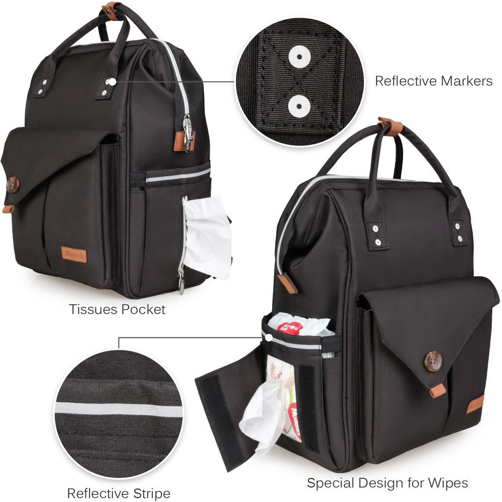 A stylish Unisex Diaper backpack is here from Alameda. We understand your need for a diaper bag and backpack which provides both functionality and style. The Black color is good for both Mums and Dads. All in all 10 pockets are what a perfect organiser backpack should have! Keep yourself hands free with detachable stroller hooks which comes free with the bag. A diaper changing mat is also included for easy nappy change. Perfect for Gifts to new moms, baby showers, kids birthday, Christmas and Halloween.