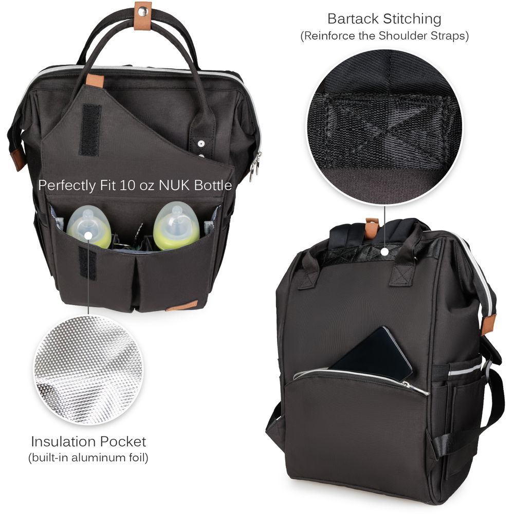 - Built-in thermal pockets keep bottles warm or cool, with extra space for spoons, bibs, and soothers.