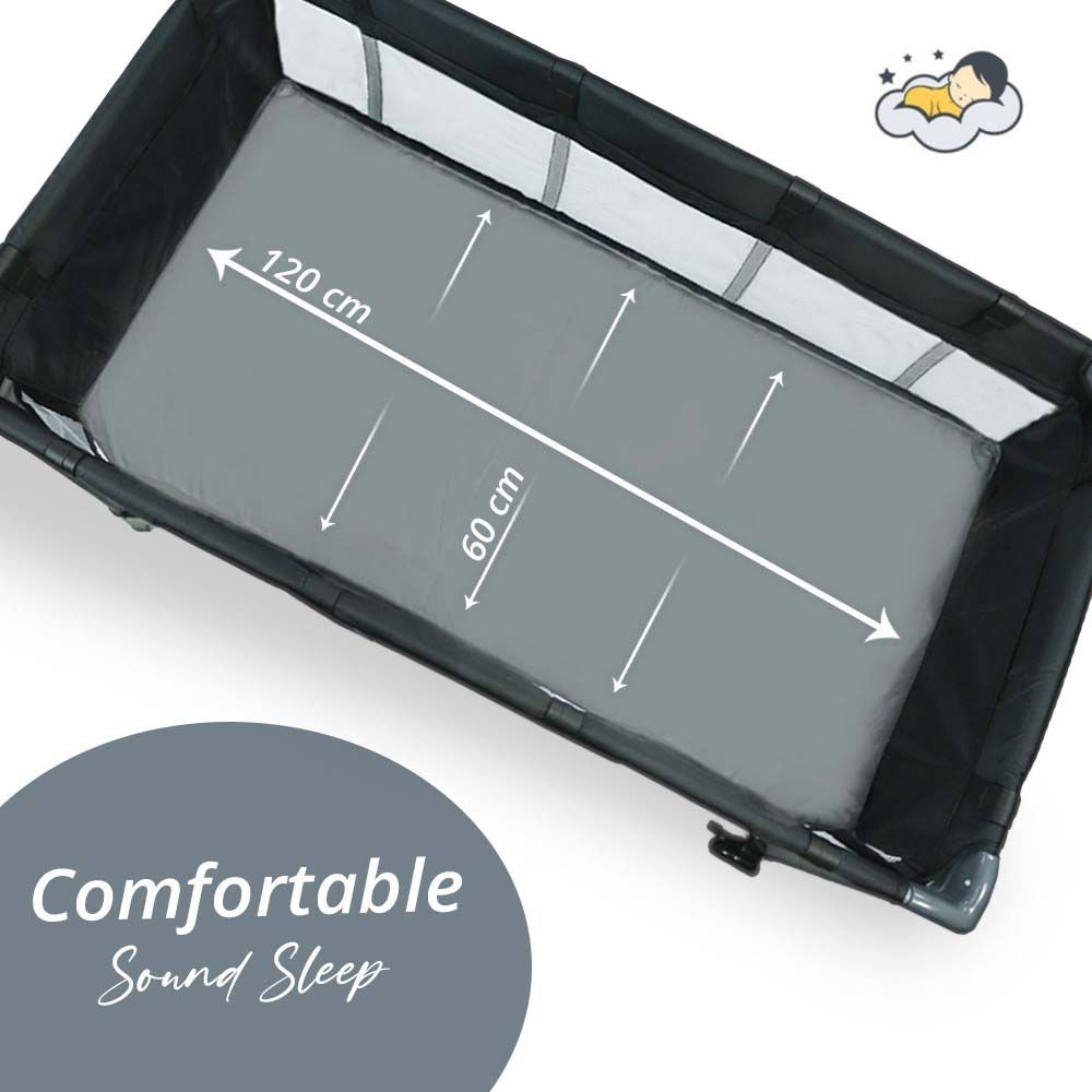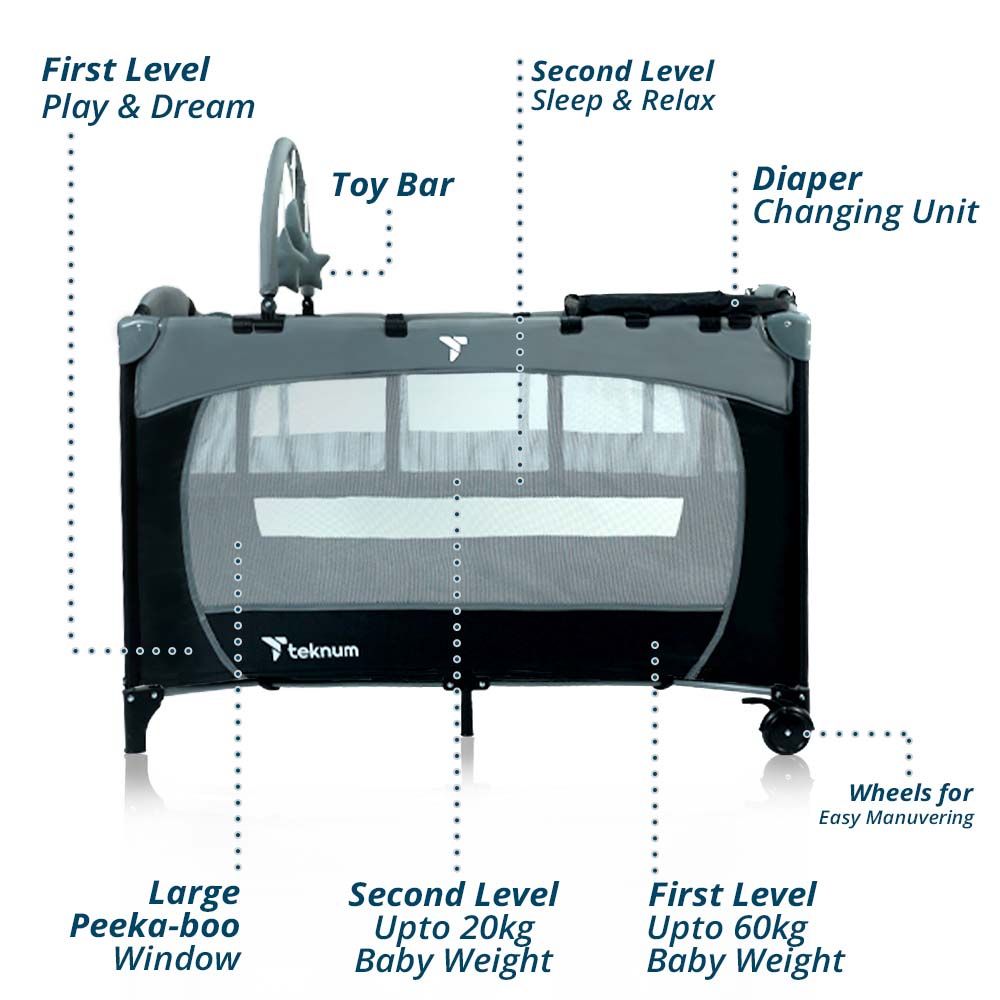 Taking care of your precious Little one has never been so easy with this amazing Foldable Cot cum Playard. This Cot has 2 in 1 qualities of a Bassinet, where your new born can sleep comfortably, on the other hand this 2nd Floor can be removed to have a spacious playard for unlimited hours of fun for your infant or toddler. The Changing Station with Organizer makes the Mum's Life easy! Keep the required things handy in the organizer and change the Nappies or make the new born change dress Safely, thanks to the elevated borders and extra space (Never leave a child unattended).