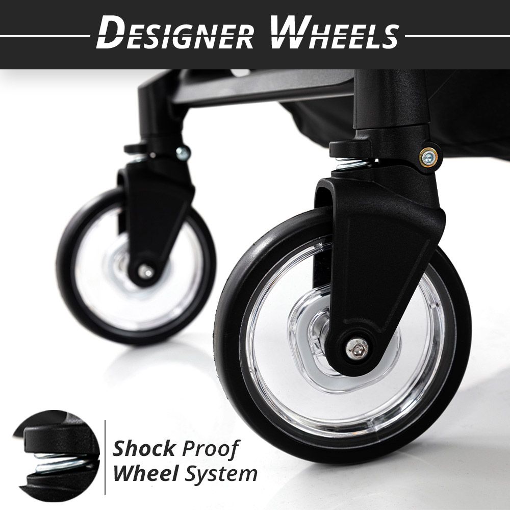 - Equipped with 6.3" EVA foam front wheels and 7.6" high-abrasion rubber rear wheels, both featuring lockable swivel and rear suspension for smooth rides over varied terrain.