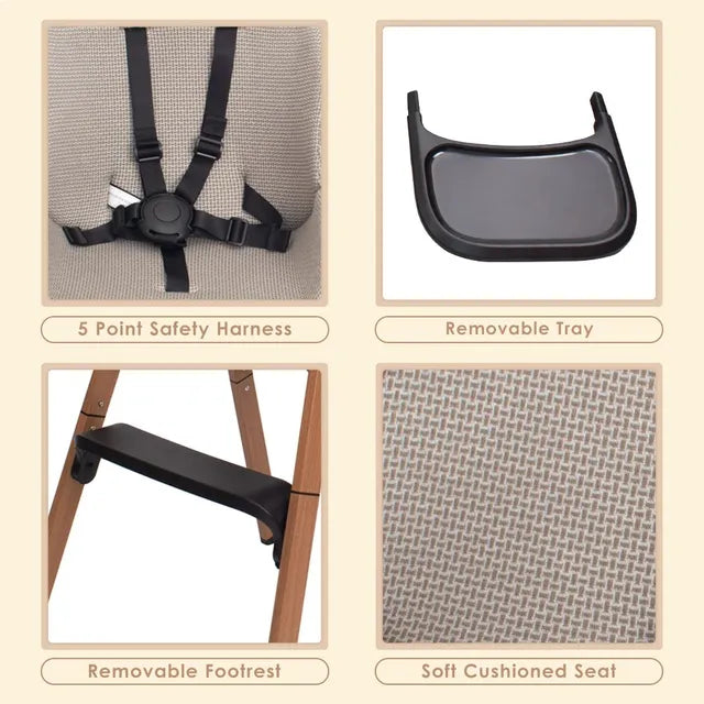 - Safe and Comfortable Seating: Includes a premium cushioned seat with a secure 5-point safety belt, supportive backrest, and footrest—providing optimal comfort and protection during meals, play, or relaxation.