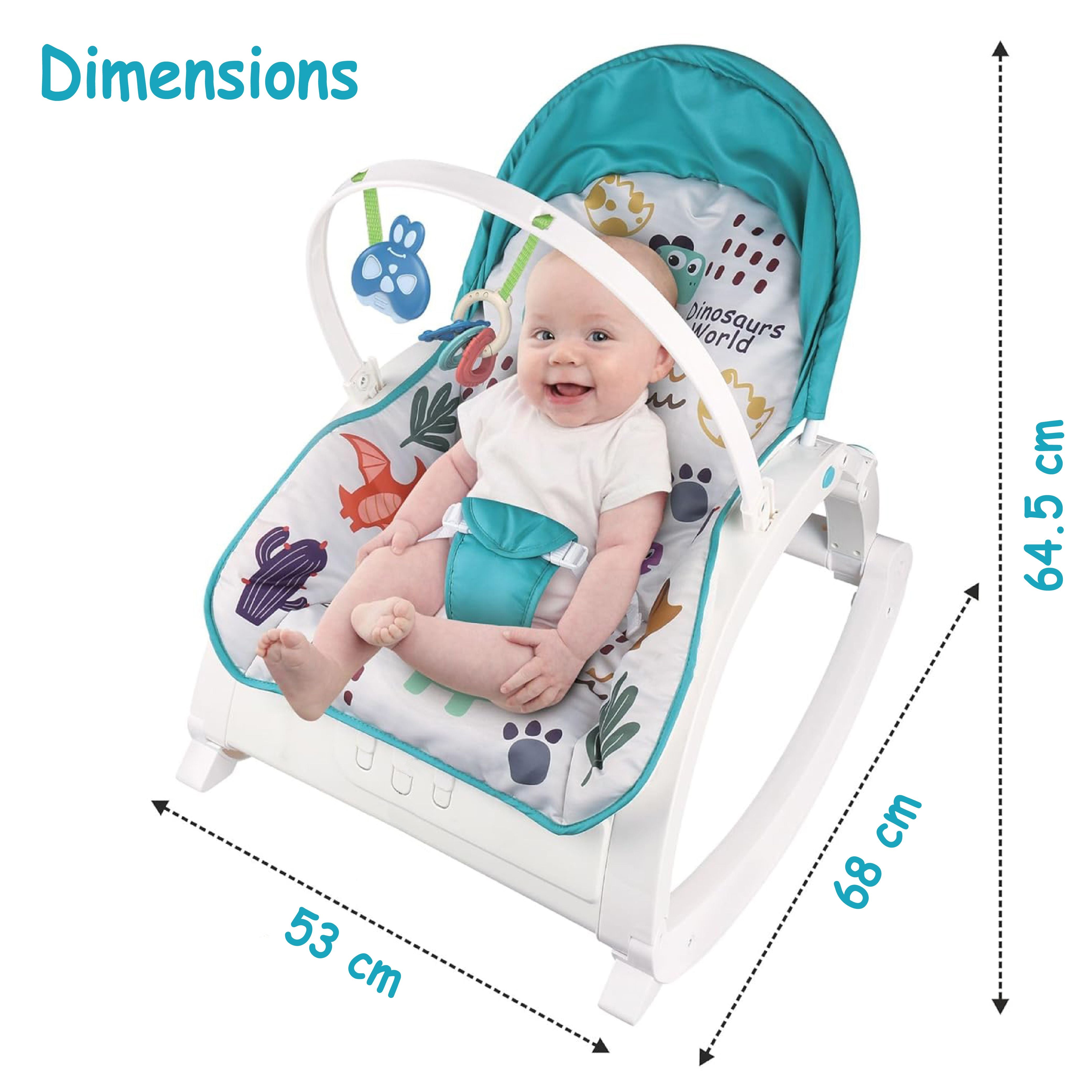 Introducing the Teknum Multifunctional Rocker/Feeding Chair/Baby Seat/Recliner a must-have for every parent looking to provide comfort, entertainment, and safety for their little one. Featuring a playful dinosaur print, this rocker offers calming vibrations and splendid music to soothe your baby, while the adjustable seat back and recline function allow for personalized comfort.