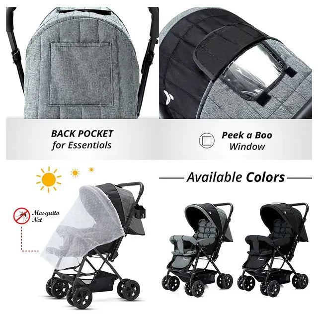 Teknum Look At Me Reversible Stroller is a perfect choice for a Robust Reversible Stroller. The handle can be easily adjusted to the view for baby looking at the mom or baby looking at the world! This Stroller is so smooth to ride and slim to pass though the standard gates. The seat can be inclined flat to let the baby sleep comfortably. Made of linen and cushioned seats provide absolute comfort for your little one. A Big Cart basket is enough to carry a lot of items. Front wheels have smooth swivel and foot activated locks. The Canopy have a transparent peek - a - boo window for the baby to feel comfortable. It's single hand folding system with easy storage while travelling.