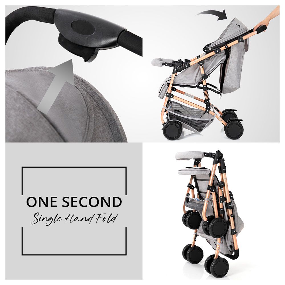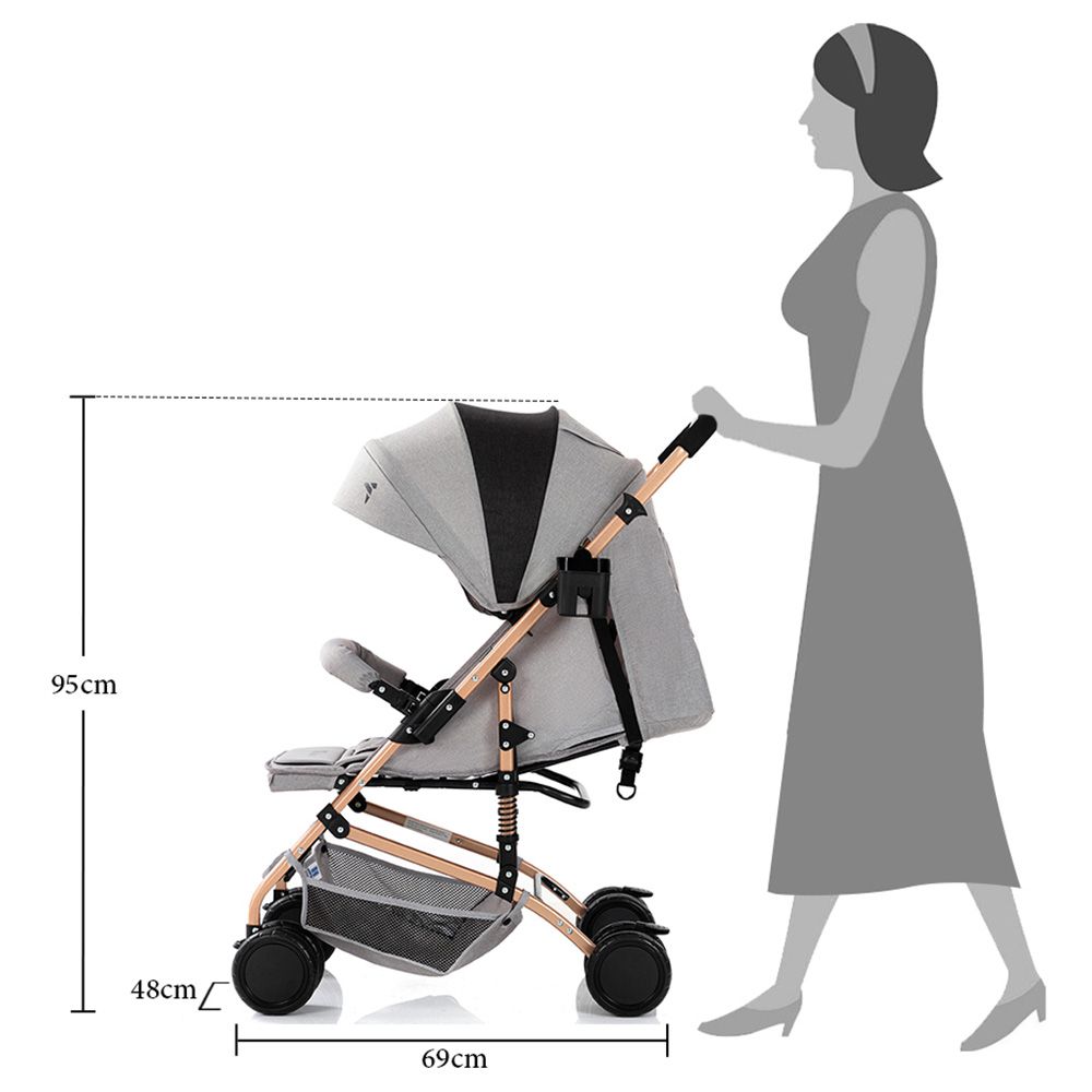 - Eye-catching gold frame and extra-wide canopy for sunny days